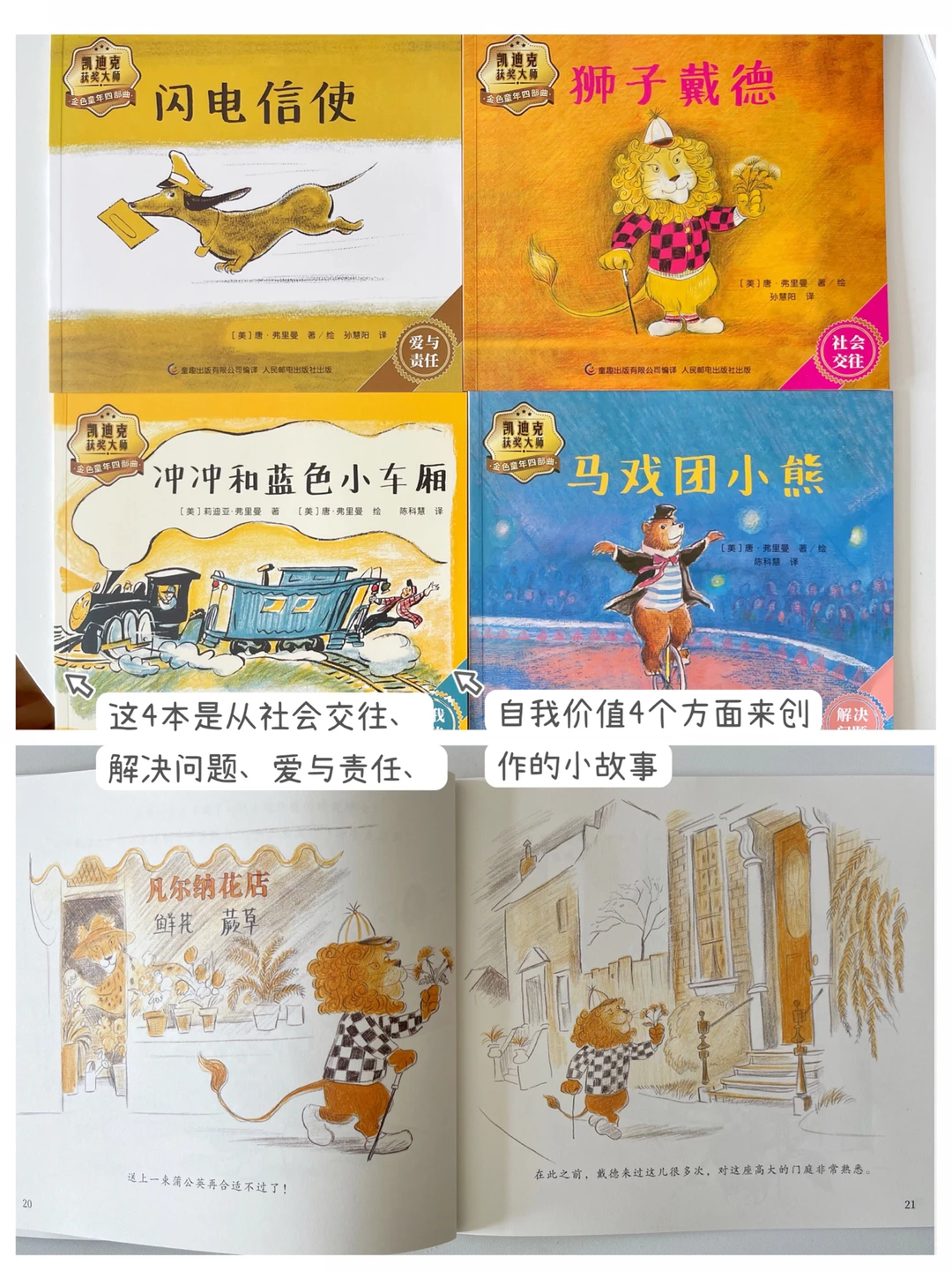 这4本是从社会交往、解决问题、爱与责任、自我价值4个方面来创作的小故事。好玩儿、幽默、温暖、温馨,是作品的主色调,建议2.5岁后可以给宝宝引入这套。