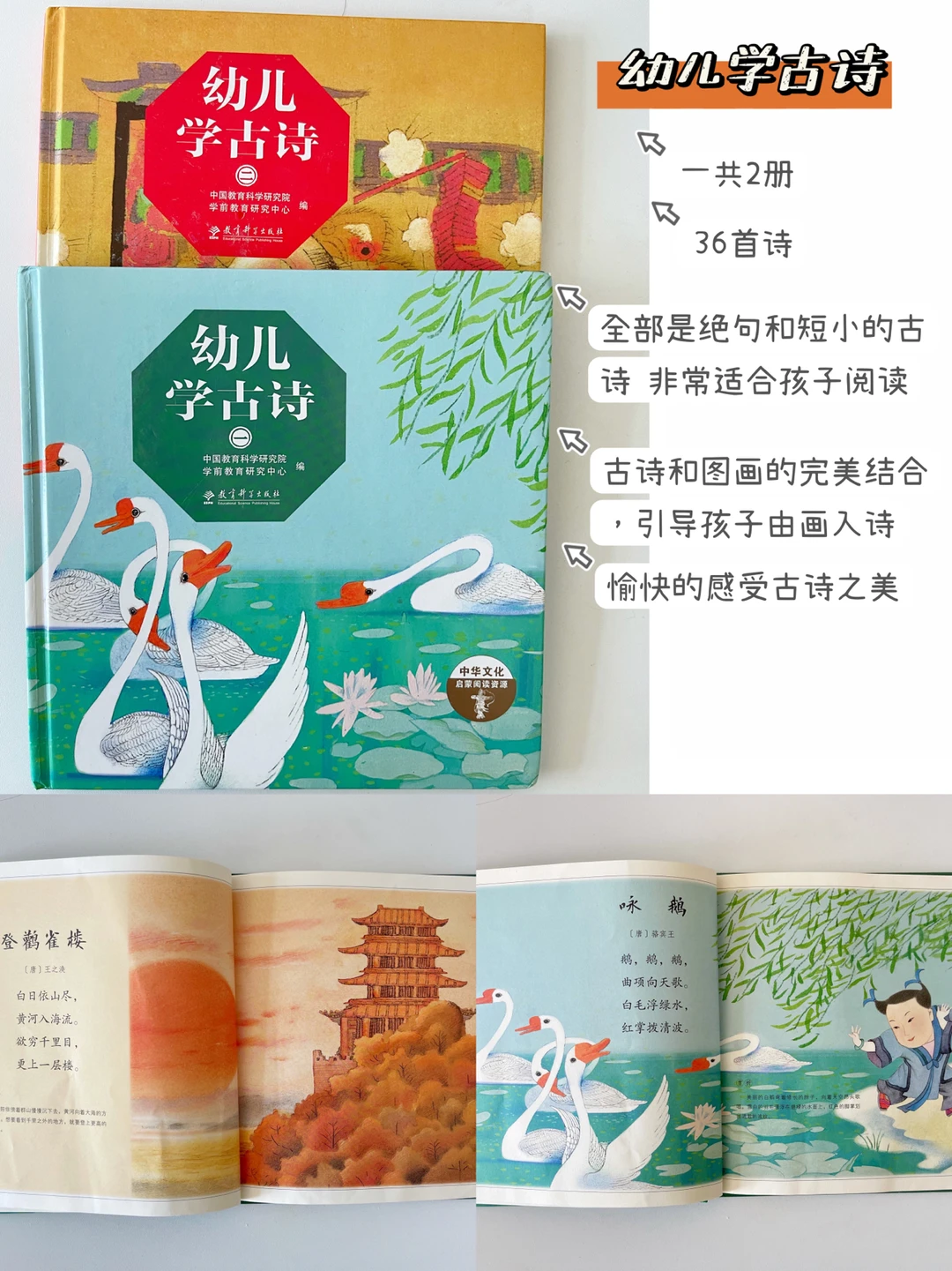 一共2册,一共36首诗,全部是绝句和短小的古诗。非常适合孩子阅读。古诗和图画的完美结合,引导孩子由画入诗,愉快的感受古诗之美。现在里面的诗我家孩子基本也都会背了。