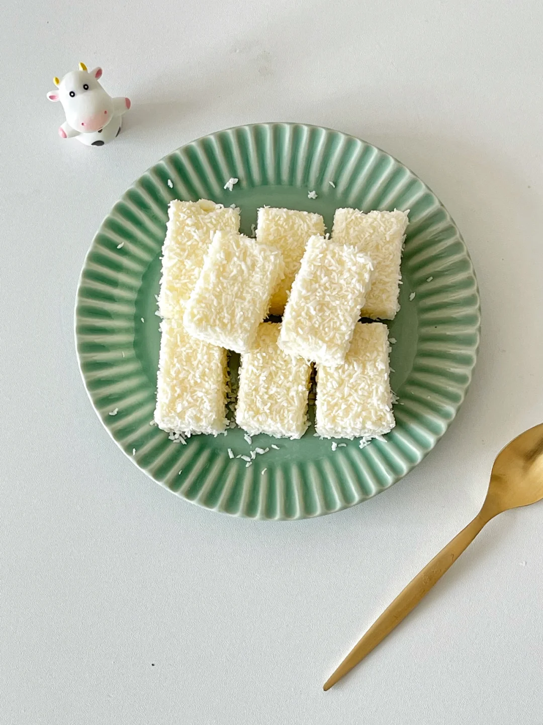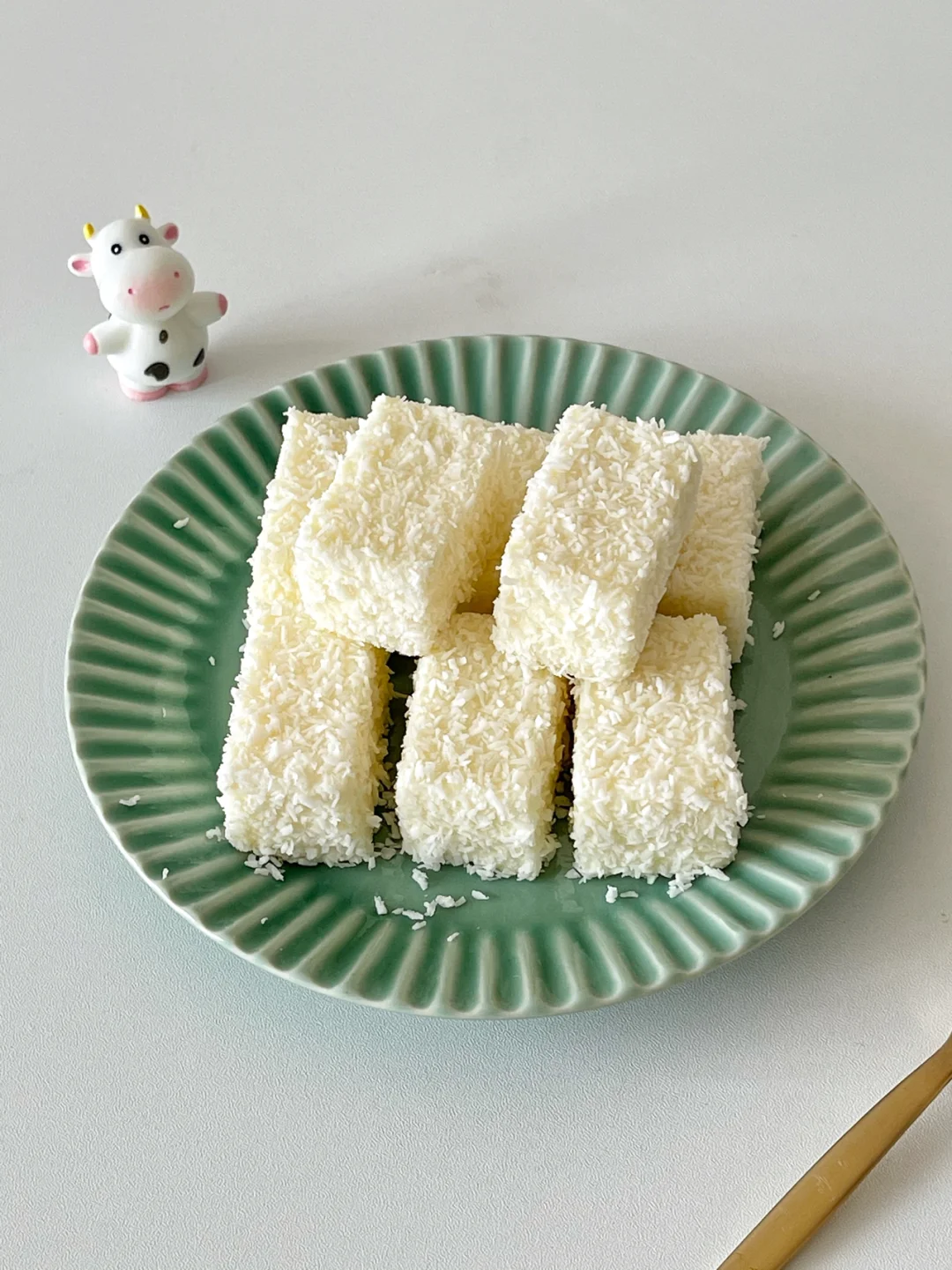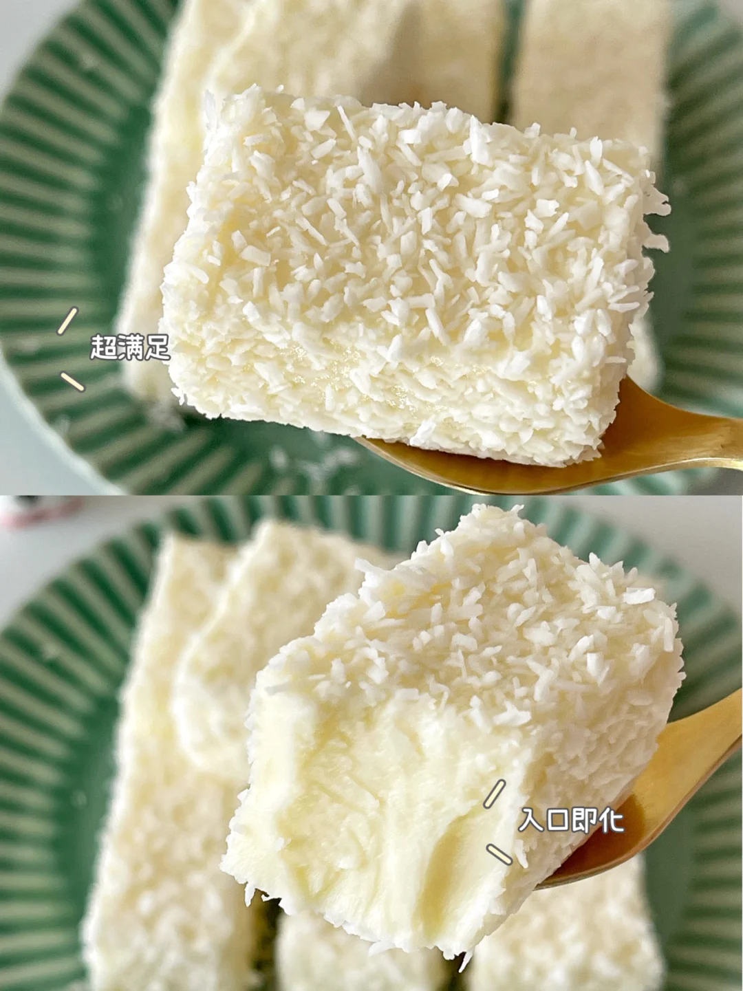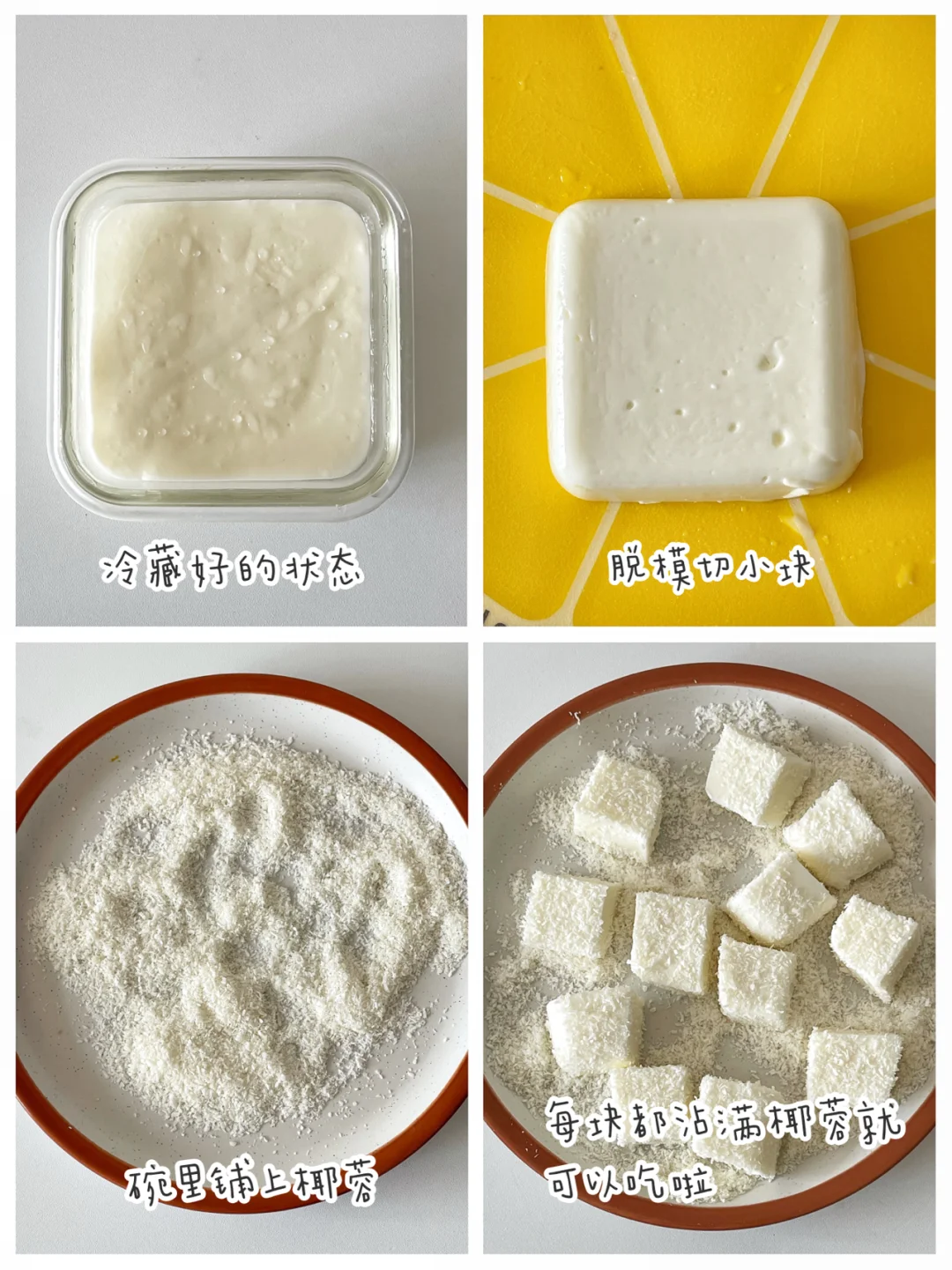 🔹取出脱膜,切小块,找一个盘子铺满椰蓉,把牛奶小方放在里面均匀的沾满椰蓉就可以享用啦.