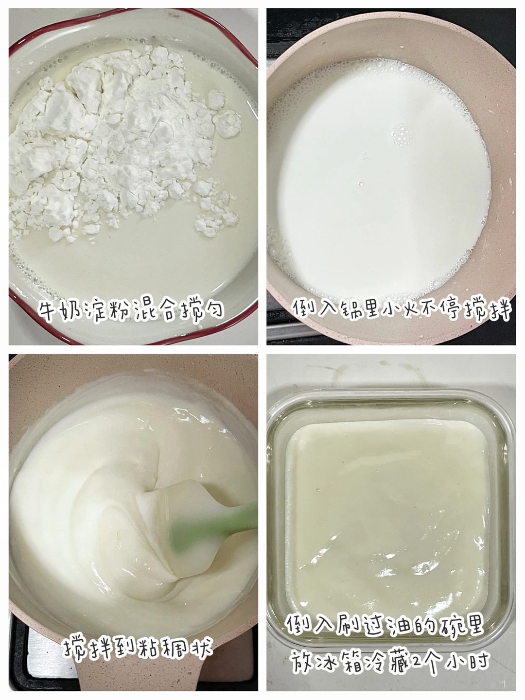 🔹牛奶和淀粉混合搅匀,倒入锅中,用小火顺时针不停搅拌,搅拌到粘稠状就可以。