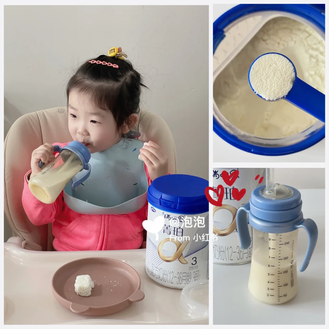 今天辅食里用的配方奶是用7勺奶粉调的(为了奶香更浓)