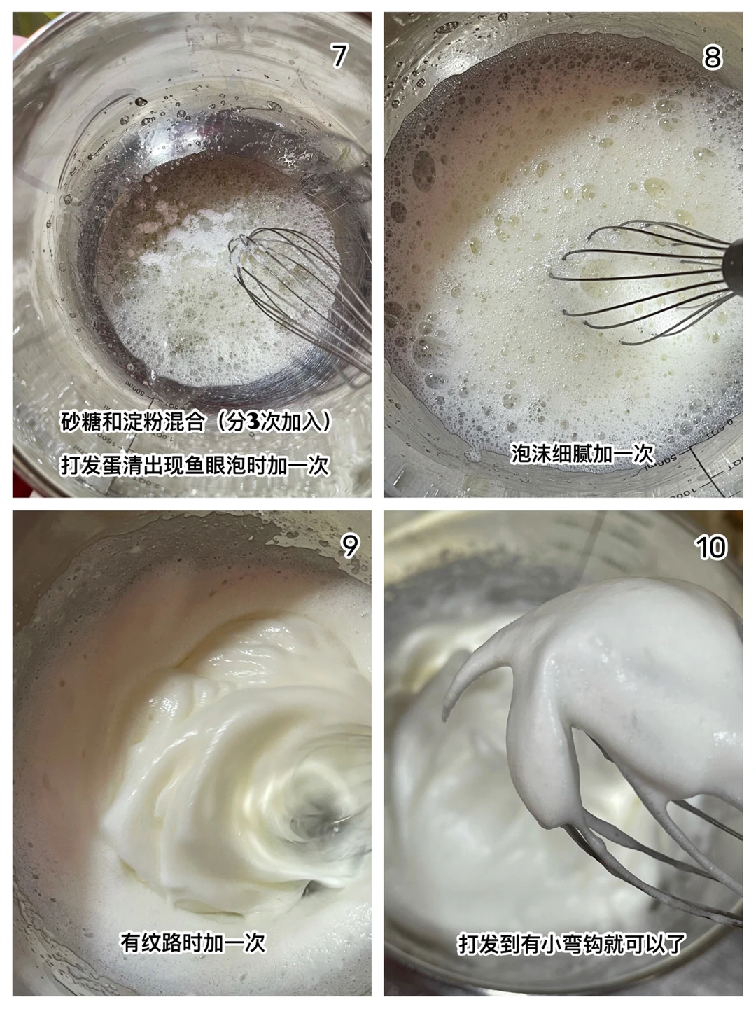 🔹蛋清糊:砂糖和淀粉混合(要分3次加入)蛋清里滴几滴柠檬汁,打蛋器打发到有鱼眼泡时加第一次,继续打发泡沫变细腻时加第二次,打发到有纹路时加入剩下的淀粉和砂糖,打发到提起打蛋器有小弯钩就可以了。