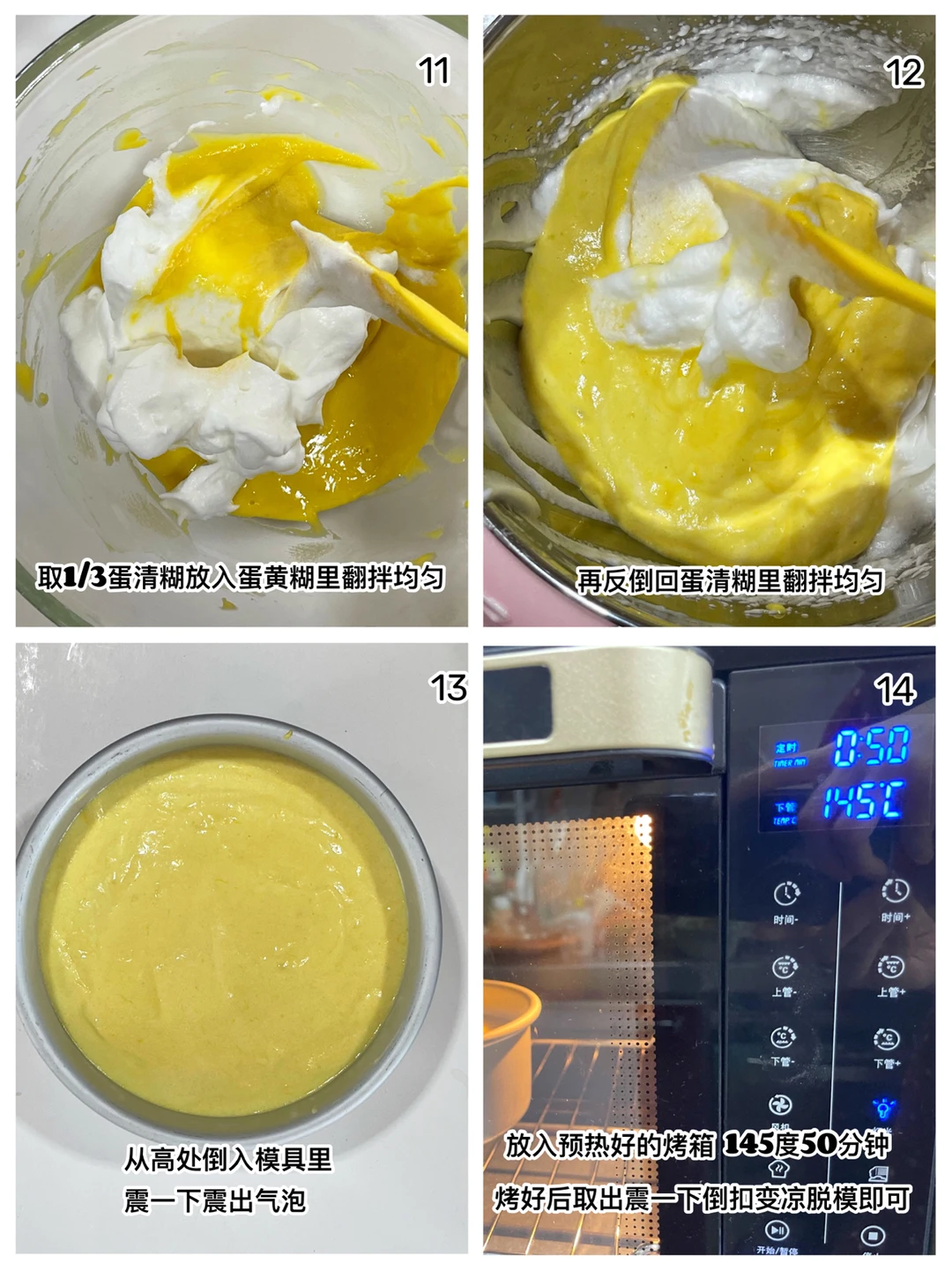🔹取1/3蛋清糊放入蛋黄糊里拌匀,再反倒回蛋清糊里翻拌均匀。从高处倒入模具里抹平表面,震一下震出气泡。放入提前预热好的烤箱,145度50分钟。