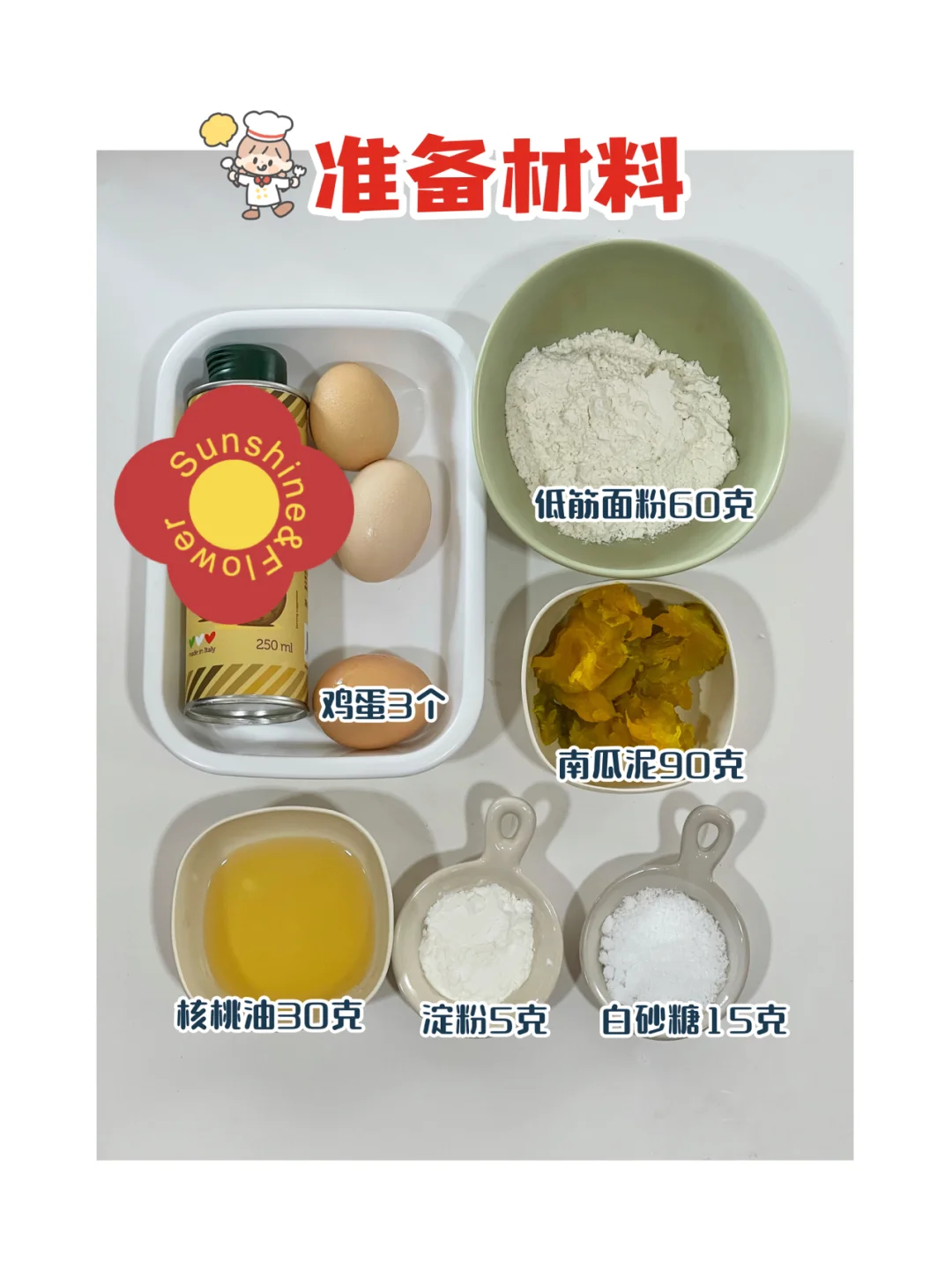 ✅准备材料:低筋面粉60克,南瓜泥90克,核桃油30克,鸡蛋3个,淀粉5克,白砂糖15克。