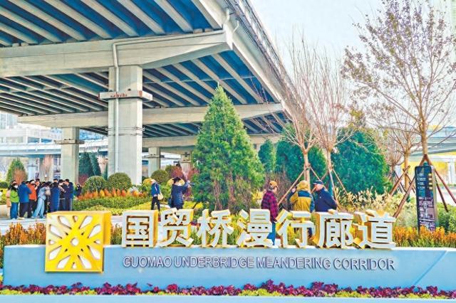 国贸桥区域桥下空间改造后打造“漫行廊道”,整合周边空间构建3.8万平方米绿化景观,成为都市生态休闲打卡点。(邓伟摄)