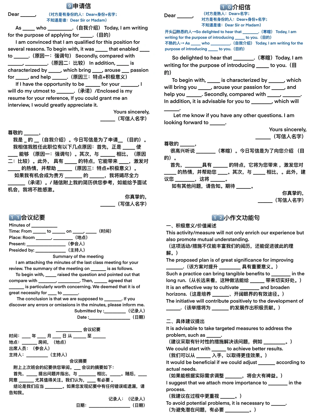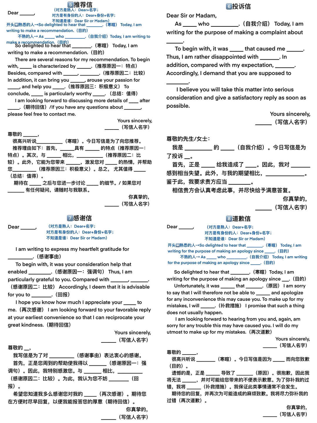 (2)后八篇分别是推荐信、投诉信、感谢信、道歉信、申请信、介绍信、会议纪要