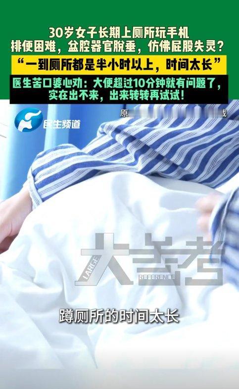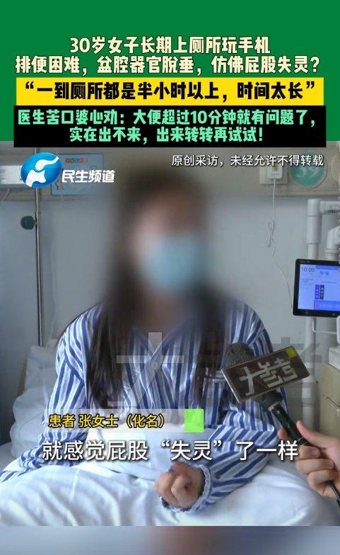 “悲剧还是发生了!”河南郑州,一女子长期上厕所时玩手机,一蹲就是半个小时,仿佛屁股失灵了一样,一点感觉都没有,不依靠药物的话一个星期都排不出来!女子去医院检查,被诊断为盆腔器官脱垂。医生:超过10分钟就有问题了! 谁没在厕所蹲着刷手机刷到腿麻过,郑州三十岁的张女士最近就真出事了,她总在马桶上抱着手机追剧刷短视频,一蹲就是半小时起,一开始只是拉屎费劲,后来得靠泻药才能拉出来,直到有一天她从马桶上站起来,腿软得站不住,医生看了都摇头,超过十分钟就有风险。 检查结果让张女士愣住了,久蹲时间太长,盆腔器官往下掉,医生说,正常人五分钟就能完的事,硬撑到二十分钟,肠道压力大不说,盆底肌肉也扛不住,现在她得重新学怎么上厕所快一点,还得做复健,才能慢慢好起来。 网友看了都说,当代年轻人哪个不是把厕所当直播间,我同事上次蹲到手机没电,差点卡在马桶上,有人晒出自己的厕所记录,追剧,打王者,看直播,人均蹲坑超过二十分钟。 医院早就说过,上厕所别待超过十分钟,别带手机,别看书,可年轻人听了当没听见,张女士这事一出,大家才真明白了,下次再想抱着手机蹲厕所,不妨先问问自己,那集剧真有那么急,还是你的屁股更值钱。 刷手机刷了半钟头,眼睛酸了,手也麻了,可就是懒得放下,躺着不动,腿像灌了铅,想站起来,身子却像被黏在沙发上,动一下都嫌费劲,朋友说你这样不行,你回他等会儿,结果一等就是半小时,手机屏幕亮了又暗,暗了又亮,心里知道该起身了,可脚就是不听使唤,不如现在就放下手机,慢慢坐起来,伸个懒腰,喝口水,别总想着等会儿,等会儿真就变成明天了。