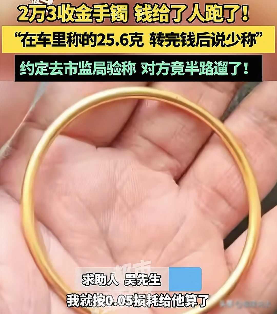 河南洛阳,男子回收一客户的黄金手镯,在车里称重是25.6克,给客户转23650元后,客户突然说想拿黄金手镯给老婆拍个照看。男子没多想,就把金手镯交给客户拍照,没想到,客户直接将金手镯揣兜里对男子说:你这克重有问题。随后,拿走了金手镯,还有那2万多也没退回,男子报警,客户说男子差了自己3克,可接下来客户的做法,让男子犯了难。 吴先生怎么也没想到,他做了这么多年黄金回收,就因为一个拍照的要求,闹出两万多元的纠纷,12月5日中午,他在洛阳一个小区门口见客户朱先生,那时候他该多留个心眼,那举动实在不对劲。 当天见面后,朱先生拿出一只金手镯,吴先生在车里用电子秤称了,净重二十五点六克,两人按行里的规矩算损耗,朱先生签了字,吴先生马上转了二万三千六百五十元,快走的时候,朱先生说想拿回手镯给老婆拍张照,这一句话,事情就变了。 他接过手镯就塞进兜里,转头说克重少算了,吴先生回忆,朱先生当场说电子秤不准,非要重新称,报警后民警拿身份证一测,秤的误差在正常范围,可朱先生还是不肯去质检,更让吴先生恼火的是,对方骑车走了就没了音信,手镯不还,钱也不退。 这场纠纷的核心在那3克差额上,朱先生说原手镯该有28.7克,可他拿不出当初的称重记录,吴先生手里有签过字的合同,上面白纸黑字写明了损耗怎么算,有围观的人说,吴先生报价时用了0.95折,等于让买家少拿了一千二百多块,这说不定就是朱先生能抓的把柄。 法律人士说,如果吴先生的秤经检查没问题,合同写得清楚,朱先生就算违约了,可手镯现在不在吴先生手里,要证明这事就难了,吴先生正打算去公证秤的准不准,朱先生一直说要走法律程序。 这事儿暴露了黄金交易里的不少问题,手持设备容易被怀疑,口头约定没法取证,拍照环节也留了把柄,两万现金和实物一起出问题,这笔交易到底是算错了,还是早就设好的圈套,答案得等司法鉴定才能出来。