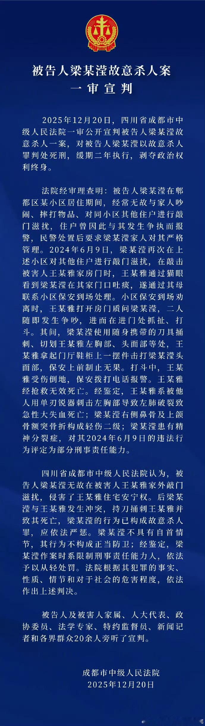 成都女子家门口遇害案的一审判决,相信刺痛了无数网民的心,也引发了大家对“公平正义”的强烈关切27岁的王某雅,只是在家中遭遇无故滋扰后正常质问,却招来杀身之祸,左胸被捅、头面部遭切划,最终因急性大失血离世,这样的悲剧太让人痛心。而凶手梁某滢长期无故吵闹、敲门滋扰邻居,案发时随身携带刀具,作案手段残忍,却因“部分刑事责任能力”被从轻判处死缓,这难免让公众产生“凶手是否钻了法律空子”的疑问。必须承认,法律对精神障碍患者犯罪的量刑有明确规定,法院的判决是基于事实和法律作出的专业裁量,这是司法公正的底线。但网民的情绪共鸣完全可以理解——当一个无辜者的生命戛然而止,当受害者母亲550多天的等待换来“死缓”结果,当“精神病”可能成为恶性犯罪的“缓冲垫”,大家揪心的是“生命是否得到了平等尊重”,担忧的是“自家门口是否还安全”。更值得深思的是,梁某滢此前已有多次滋扰他人的行为,民警也曾要求其家人严格管理,为何最终还是没能阻止悲剧发生?而且还能带着刀具?精神障碍患者的监管不能只停留在“口头要求”,家庭的监护责任、社区的预警机制、相关部门的联动管理,都需要真正落到实处,不能让“监管缺位”成为悲剧的伏笔。法律既要守住“罪刑法定”的原则,也应回应“民有所呼”的期待。一审判决不是终点,希望二审能充分考量公众的合理关切,对案件事实和精神鉴定结论进行更细致的核查,让正义既符合法律条文,也契合民心所向。同时,这起案件也该推动相关制度的完善——既要保障精神障碍患者的合法权益,更要筑牢普通民众的安全防线,让“家门口的安宁”不再成为奢望。