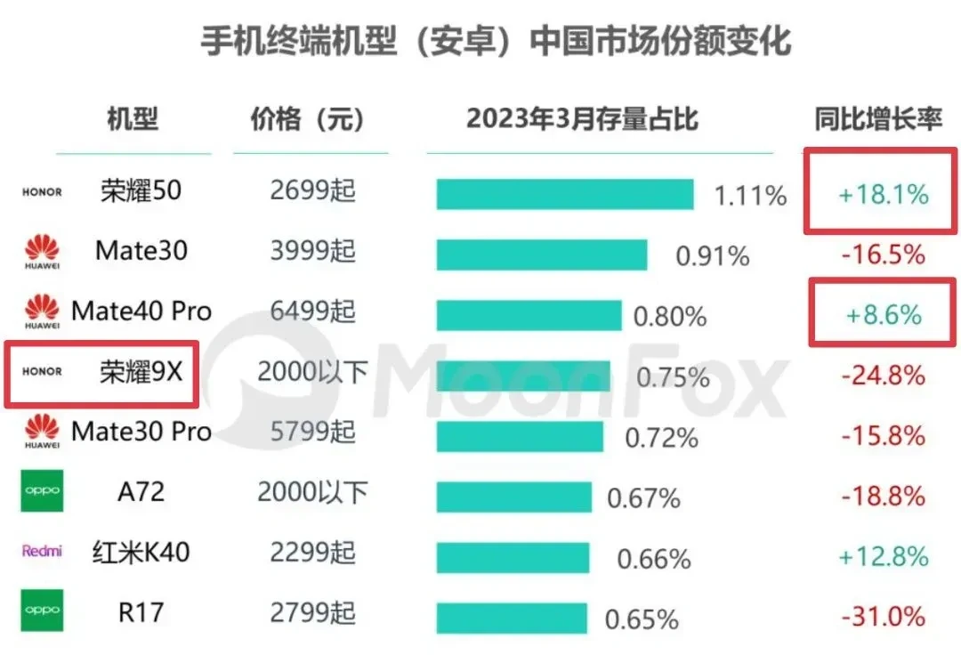 告诉我你们为什么还不换机?手机终端存量最多的居然是荣耀50,然后是华为Mate30,接着是华为Mate40Pro,还有一台是荣耀9×,没记错的话这里面有几款已经是发布接近4年的手机了,许多手机厂家都快活不下去了,是什么理由你们还不换机呢?由此表也可以看出荣耀和华为的统治力。