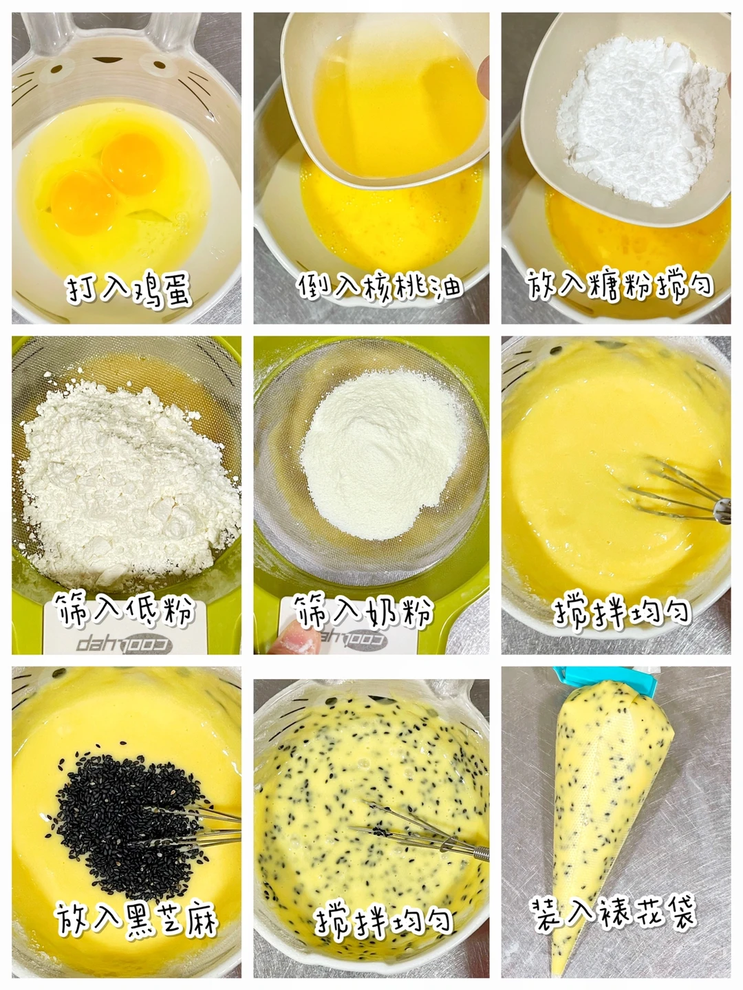 今天分享一款超好吃的宝宝小零食——黑芝麻鸡蛋小饼干,无需打发,只要搅一搅就可以搞定的哦,奶粉的奶香味加上芝麻香,简直香的不要不要了,一定要安排给你家的小可爱哦~[偷笑R] ✅准备食材:低粉60克、鸡蛋2个、核桃油40克、糖粉15克、奶粉20克、黑芝麻15克。 ⬇️制作方法:⬇️ 🔹碗里先打入2个鸡蛋,倒入核桃油和糖粉搅拌均匀。 🔹依次筛入低粉和奶粉搅拌均匀。 🔹最后放入黑芝麻搅匀,装入裱花袋。 🔹挤入烤盘,放入预热好的烤箱,160度15~18分钟即可。 ❗️(具体时间根据自家烤箱脾性相对调整)