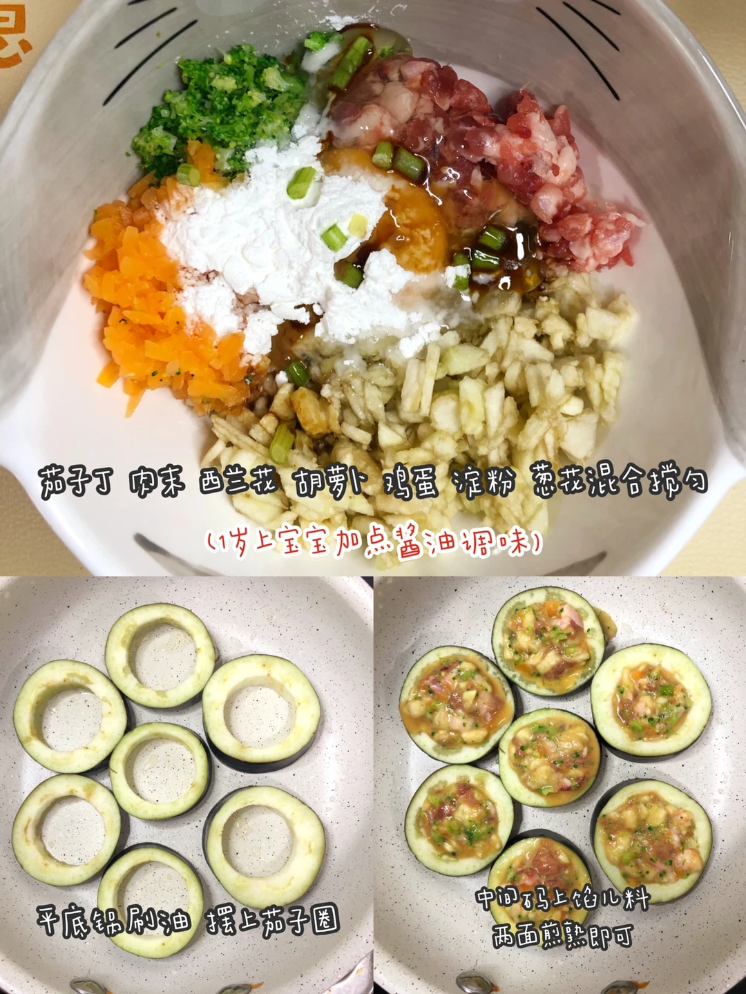 想给宝宝做一道有菜有肉的辅食,一定不要错过今天这道香煎小茄盒,做法简单宝宝又爱吃,还等什么[斜眼R] ✅准备食材:茄子、肉末、西兰花、胡萝卜、鸡蛋、葱、淀粉. ⬇️制作方法:⬇️ 🔹西兰花、胡萝卜焯水切碎末. 🔹茄子切片.用裱花嘴⭕️这头把茄子中间扣出. 🔹扣出的茄子切小丁.和西兰花、胡萝卜混合,打入一个鸡蛋、一勺淀粉,一勺酱油搅匀.(1岁下用香菇粉调味) 🔹平底锅刷油,油热后放入茄子圈,中间填上肉馅,小火两面煎熟即可.