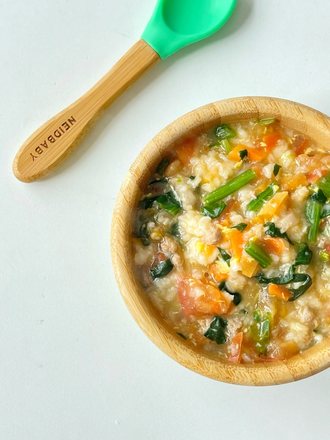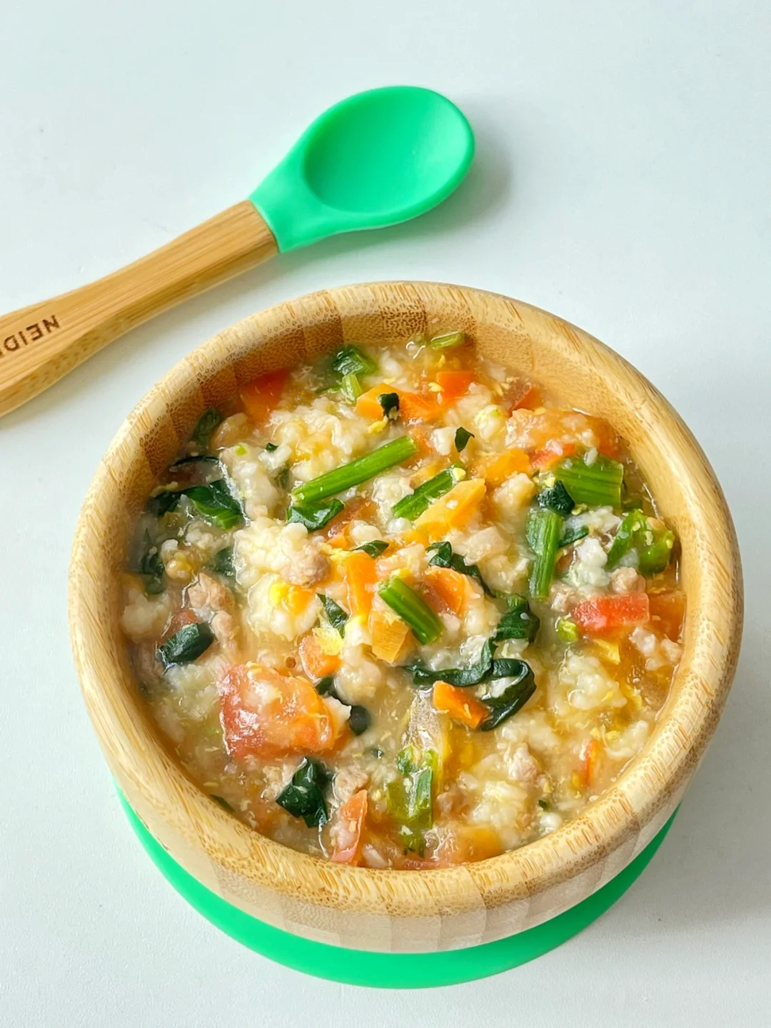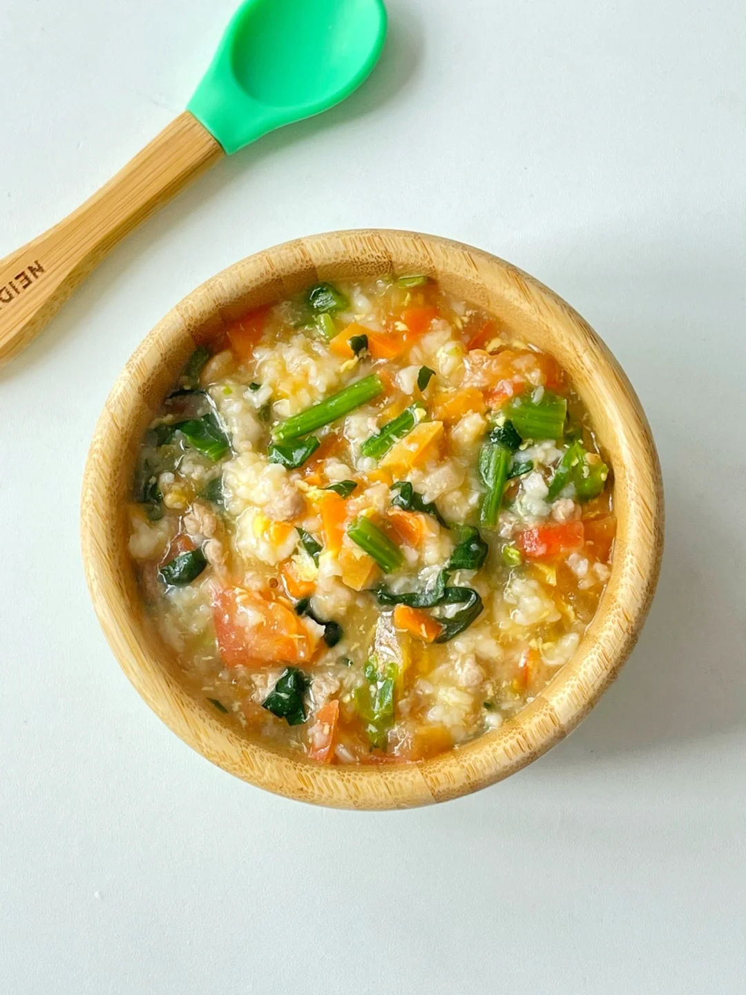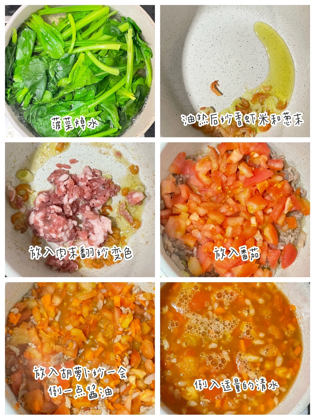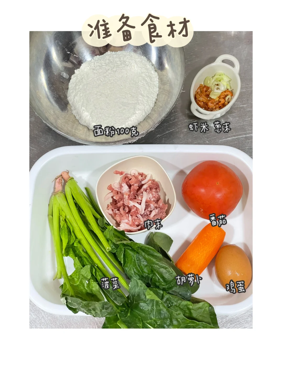 ✅准备食材:肉末、番茄、胡萝卜、菠菜、鸡蛋、面粉100克、虾米、葱末。