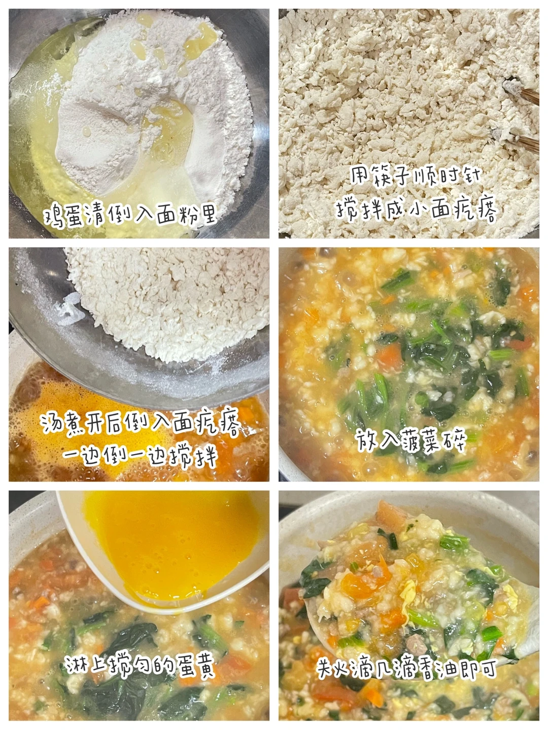 🔹煮开后放入面疙瘩,一边倒一边搅开,放入菠菜碎,煮开后最后淋入搅匀的蛋黄。