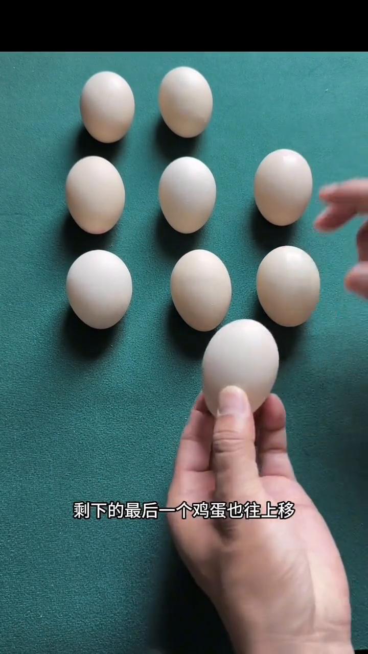 连科学也无法解释神奇鸡蛋无中生有。 据说这是连科学都无法解释的神奇反自然现象。桌面上用8个鸡蛋摆了这么一个图形,很明显中间这里少掉了一个。别眨眼,接下来把右边这一个移到中间去,然后把右上角的鸡蛋移到左边来,把左下角的鸡蛋移到右边来,下面的这个鸡蛋同样也往上移,剩下的最后一个鸡蛋也往上移。 此时你会发现鸡蛋竟然一个也没少了,这到底是怎么回事?难道这就是传说中的无中生有吗?评论区有谁能解释一下?