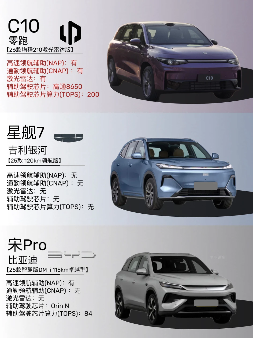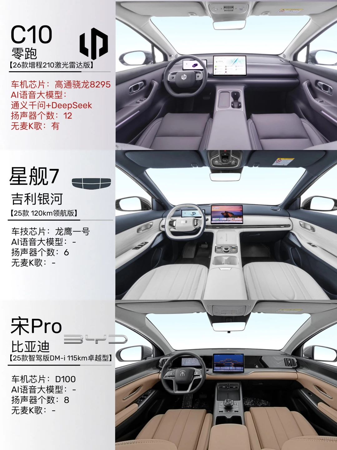 ✔️智能方面,零跑C10车机用的是高通8295芯片,配备激光雷达和高通8650辅助驾驶芯片,高速领航辅助(NAP)特别稳,自动变道、跟车都像老司机一样,新手开长途也能轻松不少。银河星舰7的芯片是国产龙鹰一号,流畅度还行,但智驾功能比较基础,没有高速领航辅助。比亚迪宋Pro的芯片性能一般,智驾也只有基础的ACC自适应巡航。
