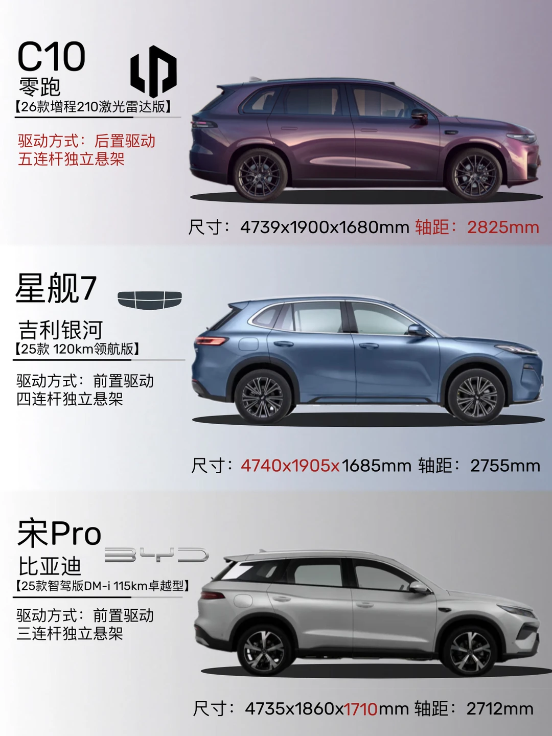 ✔️底盘悬架及驱动,零跑C10底盘采用前麦弗逊-后五连杆独立悬架,五连杆悬架在同价位少见,能减少横向晃动,提升抓地力,过弯更稳。平时过颠簸路面、高速行驶、激烈驾驶都能很好的支撑。而且采用的是后驱方式,无论是加速性能还是转弯灵活,都表现不错。银河星舰7配备的是四连杆悬架,前置驱动,基本可以满足日常出行。宋Pro采用的三连杆悬架,前置驱动,因此乘坐的舒适性表现中规中矩。