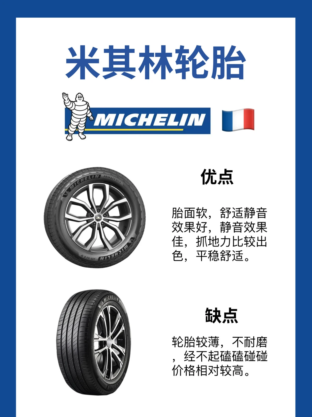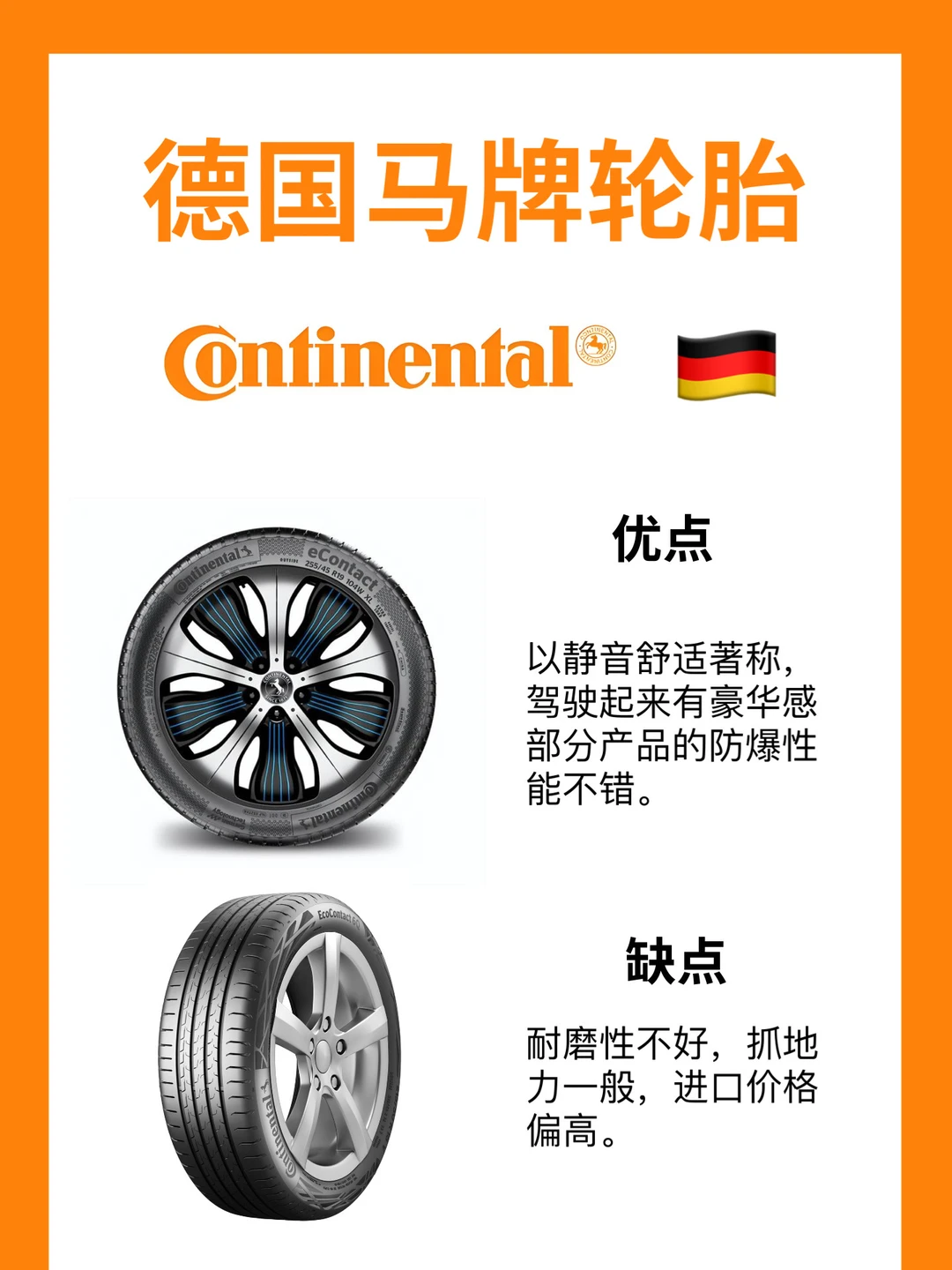 优点:百年品牌,品质高,较高的抗暴能力,静音舒适性佳,制动性好,安全性高,产品丰富多样。