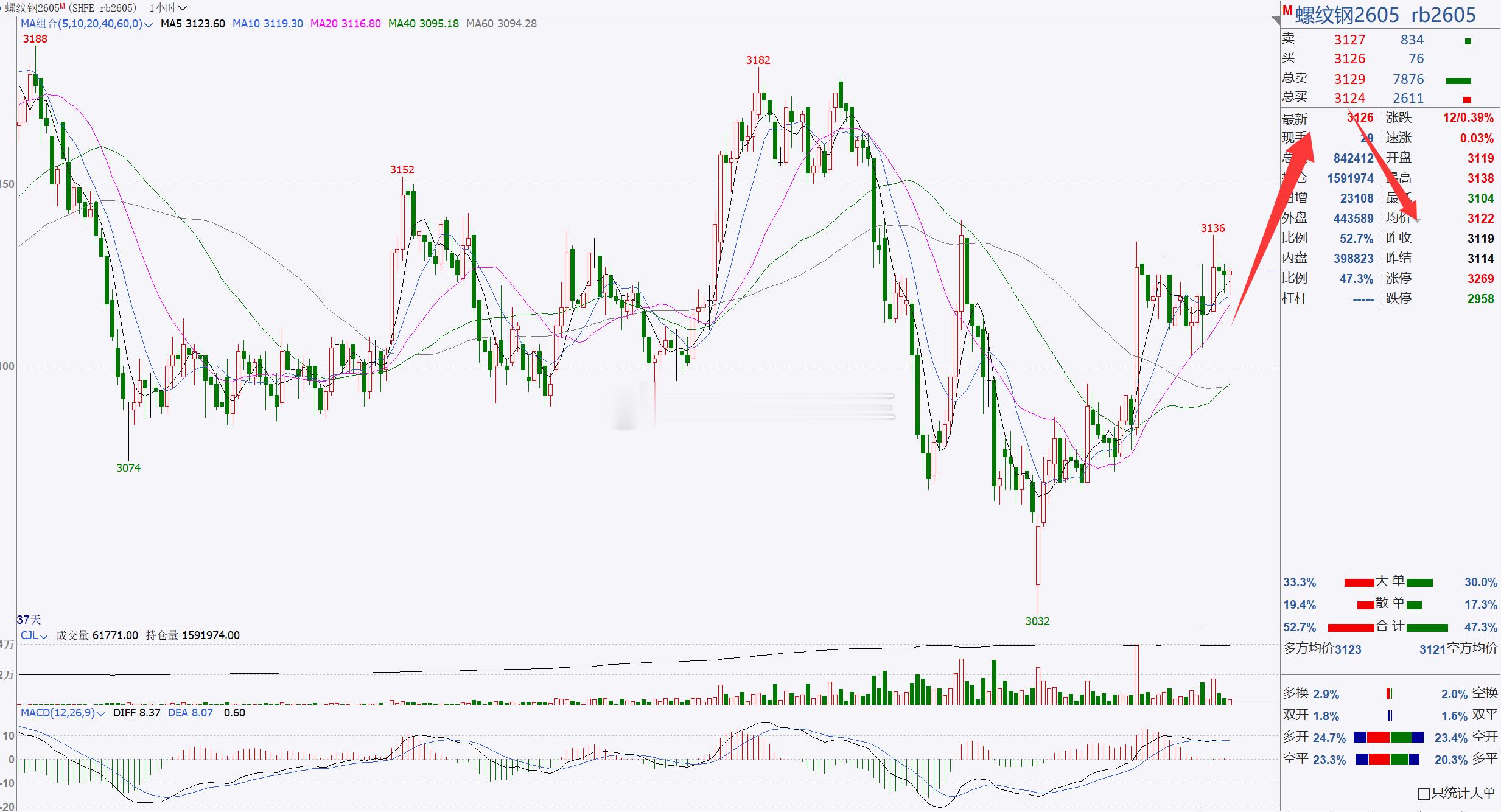 1、【焦煤2605】焦煤建议关注1100一带,看短期反弹修正!焦煤反弹调整后,目前处于1100一带横盘调整,后市建议重点关注此位置,若此位置企稳,建议短线偏多,先看反弹修正;稳健者建议先观望;例如多关注1098—1088附近,上方先关注1150附近,突破再关注1200附近;空关注1150、1200这两个位置再择机考虑介入;(建议仅供参考,具体操作以开盘点位实时跟进,据此操作风险自担)2、【螺纹2605】螺纹建议关注3100一带,可先看短期反弹修正!螺纹反弹调整后,目前处于中期横盘调整,后市我们重点关注3100一带,若此未能企稳,可继续看反弹修正,稳健者建议先观望;例如多关注3100—3080附近,上方先关注3180附近;空关注3180突破情况再择机考虑介入;(建议仅供参考,具体操作以开盘点位实时跟进,据此操作风险自担)3、【铁矿石2605】铁矿石建议短线偏多!铁矿石目前反弹调整,行情偏强,后市我们可继续看反弹调整,但不过分看空间,短线即可,重点关注800整数一带!例如多关注774—770附近,上方先关注800附近,突破再关注805附近;空关注800、805这两处再择机考虑介入;(建议仅供参考,具体操作以开盘点位实时跟进,据此操作风险自担)焦煤焦炭螺纹热卷铁矿石