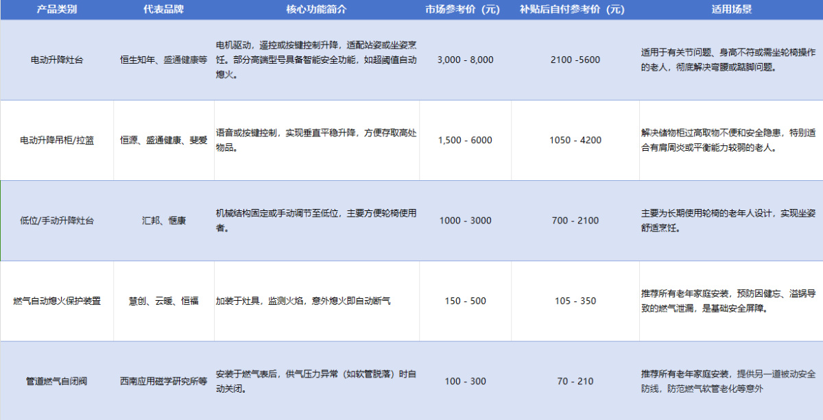 根据清单,厨房适老化改造核心在于解决老年人够不着、怕危险、操作费力三大难题,主要产品可归为两类: