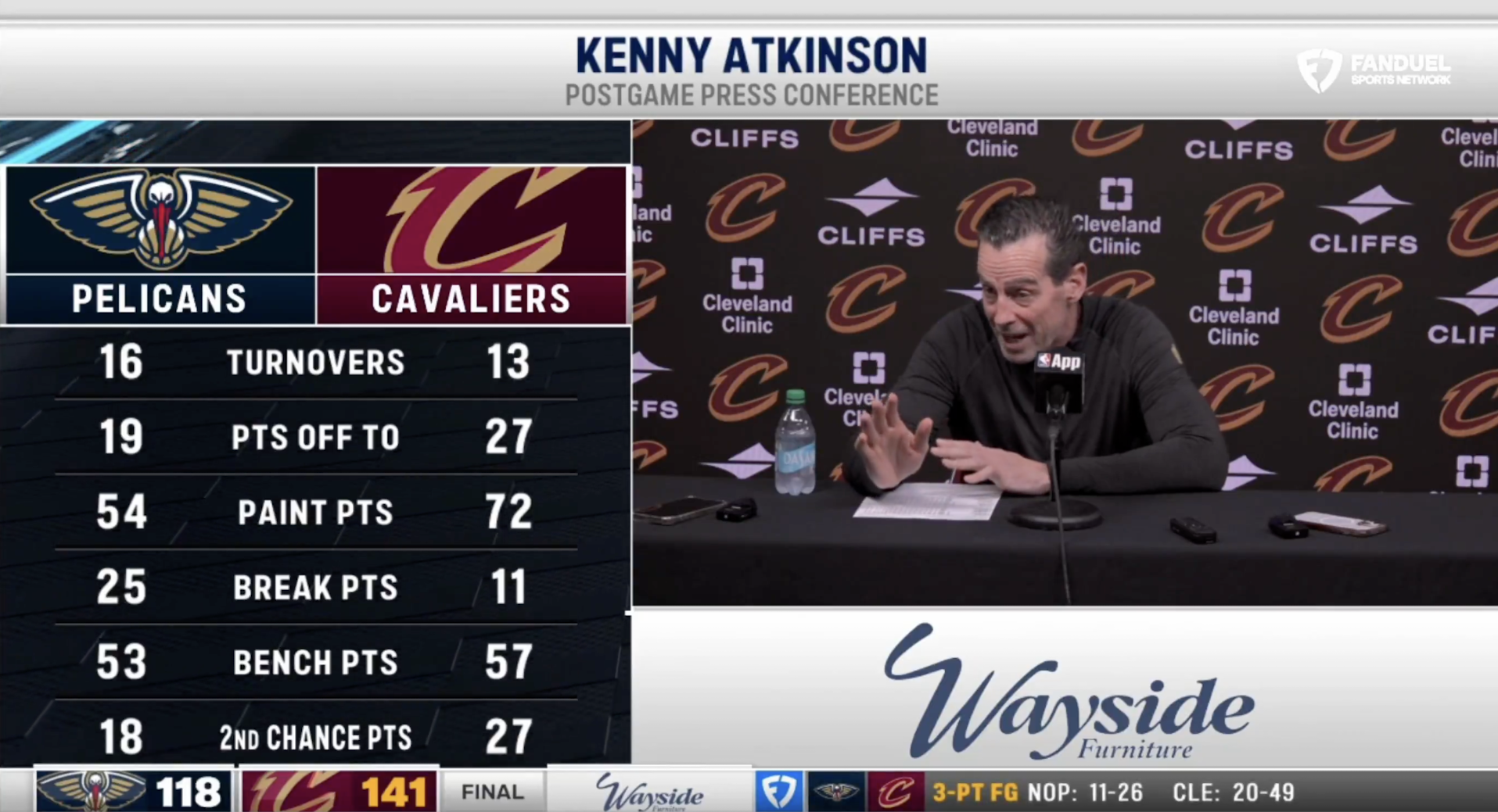 虎扑12月24日讯今日NBA常规赛,骑士141-118击败鹈鹕。