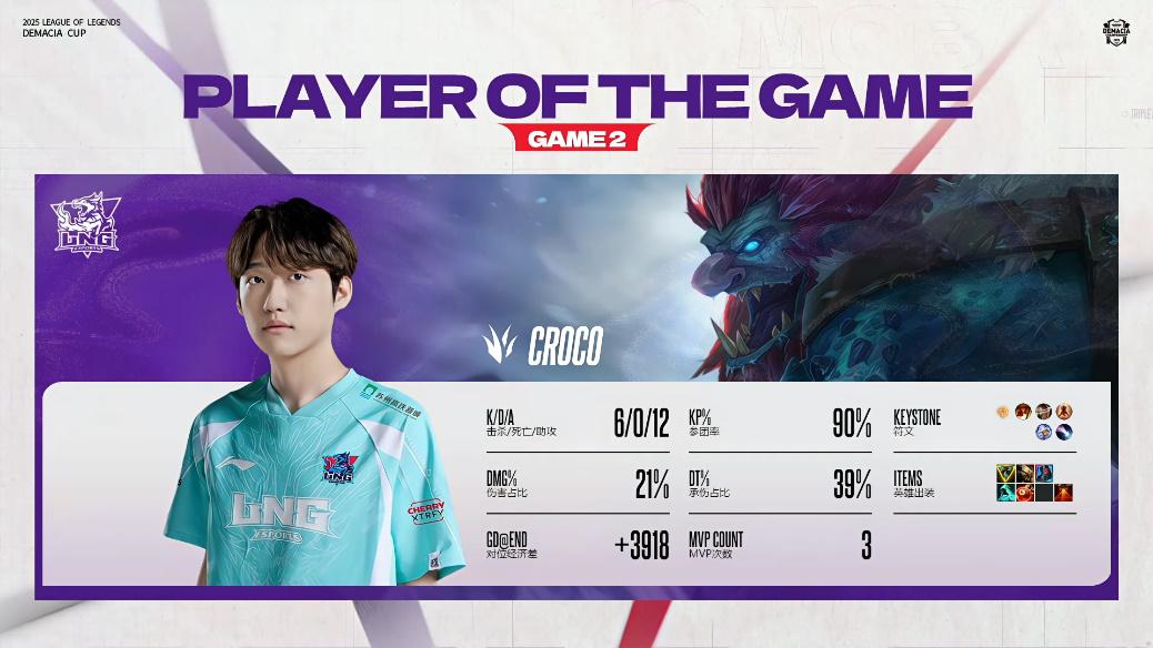 Croco巨魔打出6/0/12战绩,斩获LNG对战OMG次局MVP