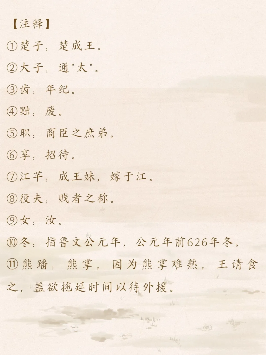 (鲁文公元年)十月,商臣率东宫甲士围宫,成王哀求能不能让他吃完熊掌再死?因为他知道熊掌难炖,想拖延等外援,被商臣冷酷拒绝。楚成王被逼自缢,商臣刚开始赐他一个坏谥号“灵”,见其父尸不冷、目不闭,改谥为“成”,肯定他的功绩,这才闭目。