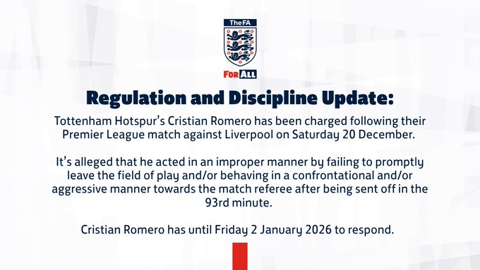 托特纳姆热刺队的克里斯蒂安-罗梅罗在12月20日星期六对阵利物浦的英超联赛后被指控行为不当。