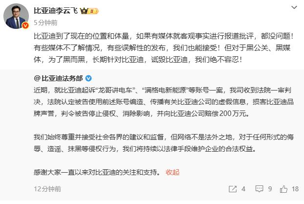 比亚迪品牌及公关处总经理李云飞转发并配文:比亚迪到了现在的位置和体量,如果有媒体就客观事实进行报道批评,都没问题!有些媒体不了解情况,有些误解性的发布,我们也能接受!但对于黑公关、黑媒体,为了黑而黑,长期针对比亚迪,诋毁比亚迪,我们绝不容忍!