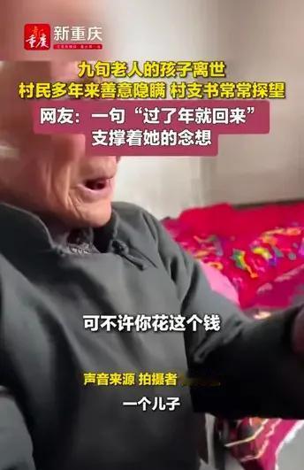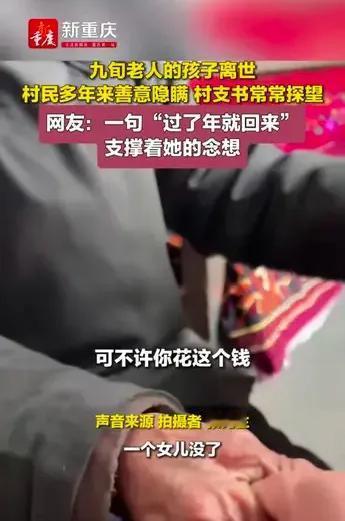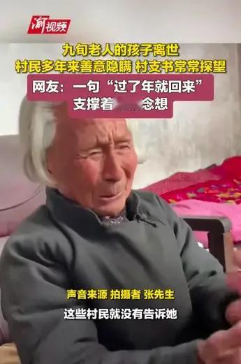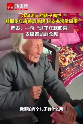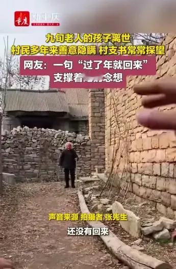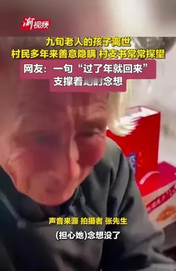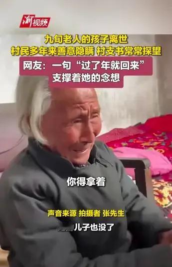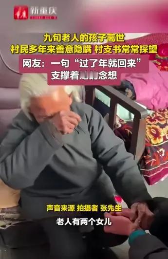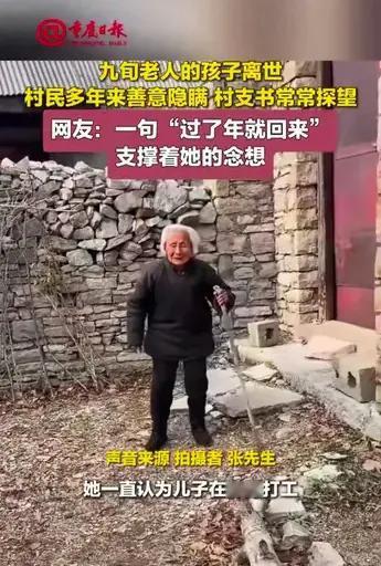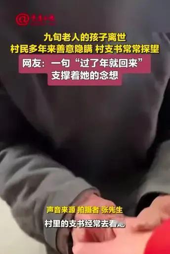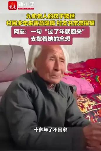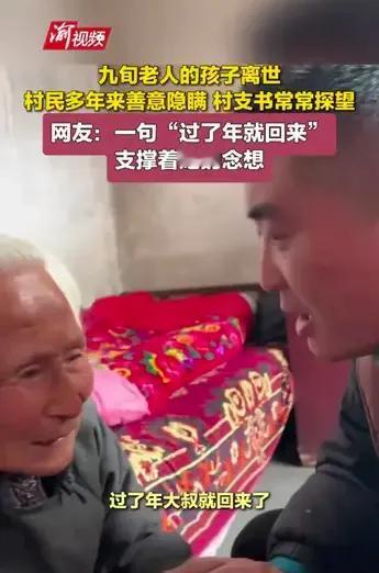 九旬老妇人有一个儿子,两个女儿,一个女儿离世,儿子也已离世十多年。村里人为了怕老人伤心都瞒着她,没有告知真相。老人一直以为儿子在外打工,只是没有回来。 村支书经常来看望,老妇人向村支书诉苦,说儿10多年了也不回家,我养这个儿子有什么用啊?还多亏了你们天天来看我。村支书安慰她说:大叔过了年就会回来的。 一句话给了老人一点希望和安慰和盼头。 老人浑浊的眼神里全是期盼。也许在心里疑惑。儿子怎么会10多年不回来呢?可是她不敢往坏处想。