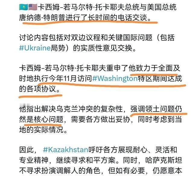 估计俄罗斯也深感意外!在访俄完毕之后,哈萨克斯坦总统托卡耶夫第一时间跟美国总统特朗普进行了通话。 2025年12月22日,托卡耶夫去圣彼得堡开独联体领导人非正式会议,跟普京单独聊了聊,双边贸易快到300亿美元,还谈能源合作。托卡耶夫说两国关系在进步,普京觉得没啥大问题。刚散会,第二天托卡耶夫就给特朗普打电话,聊得挺深。哈萨克斯坦新闻说,两人交换双边议题意见,还包括乌克兰局势。托卡耶夫先说会按11月访美协议全落实,贸易投资那些。接着提乌克兰冲突复杂,领土问题是核心,各方得现实点让步。 哈萨克斯坦呼吁大家耐心、灵活、专业推进和平,但不做调停人,只提供场地如果需要。托卡耶夫夸特朗普领导力强,帮解决国际军事冲突,还推美国国内发展。末了,托卡耶夫邀特朗普方便时访哈萨克斯坦,说这趟有历史意义。通话后,哈萨克斯坦外交显示出多元味,尽管俄罗斯可能不爱看,但哈国就是在大国间找平衡,最大化自己利益。托卡耶夫对特朗普的赞扬和邀请,稳固对美关系意图明显。在乌克兰问题上,托卡耶夫不卷入,但领土强调得重。 哈北部俄罗斯族多,历史上边界和分离风险大,托卡耶夫以国家领土完整为底线。如果俄乌结局动摇这原则,哈国得警惕。周旋大国,托卡耶夫护自家利益,避免陷博弈漩涡。这通话时机敏感,刚访俄结束,估计俄罗斯意外。哈萨克斯坦外交策略就是这样,不偏不倚,抓机会发展。托卡耶夫处理方式显示中亚国家在大国夹缝求生存的现实,平衡俄罗斯影响和美国合作。乌克兰议题上,哈国立场中立,但领土敏感源于自身历史。俄罗斯族聚居区问题让哈国警觉,避免类似冲突波及。托卡耶夫外交注重实际,不卷入大国对抗,专注经济安全合作。 通话后,特朗普在社交平台说邀托卡耶夫和乌兹别克斯坦总统去2026年迈阿密G20峰会,扩大合作。托卡耶夫积极回应,推动哈美关系深耕安全、经济领域。两国继续交换全球安全意见。特朗普发帖说俩通话愉快,谈和平、贸易合作,还说关系好,邀他们当客人。哈萨克斯坦回应推动协议落地,价值170亿美元能源贸易那些。官员互访多,谈安全机制。两国保持联络,协调立场。后续发展显示哈美关系升温,中亚国家借机拉近西方,避免俄罗斯独大。G20邀请让哈萨克斯坦国际曝光多,经济机会增。