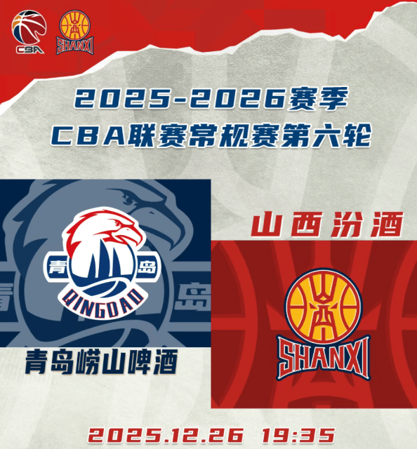 虎扑12月25日讯据山西男篮官方发文,北京时间2026年12月26日19:35,2025-2026赛季CBA联赛常规赛第六轮继续进行,山西汾酒客场挑战青岛崂山啤酒。