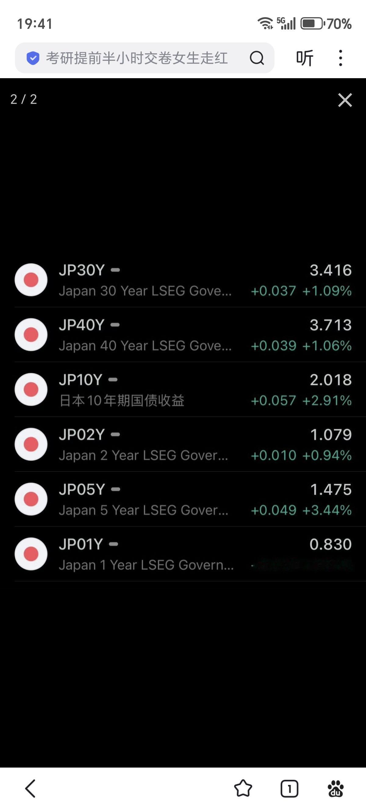 无人在意的角落:人民币兑日元创历史新高 最近人民币兑日元突破 1 CNY ≈ 22.4 JPY,创下历史新高。回看历史: 2019年约 1 CNY ≈ 14.8 JPY 2011年约 1 CNY ≈ 11.9 JPY 换句话说,同样一笔人民币,现在能换到的日元比2019年多出约50%,比2011年多近翻倍。 同时日本国债收益率全线暴涨,10年期国债收益率升破2%,这也意味着国债价格全面暴跌 整个日本经济正处于风雨飘摇之中,这下日本赌国运的可能又上升了