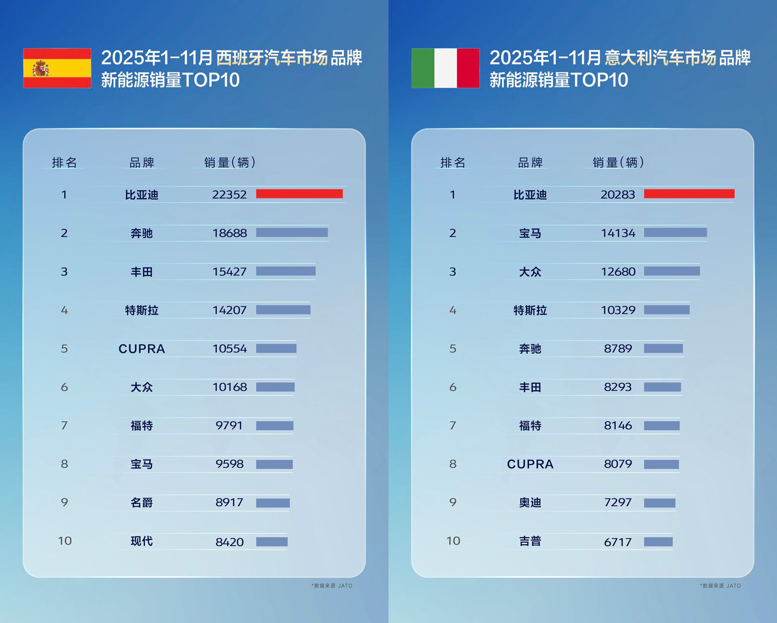 而且这可不是单纯卖得多,还拿奖拿到手软。11月在巴西、土耳其、意大利这些国家,比亚迪直接拿下新能源销量第一;在新加坡更厉害,直接登顶全品牌销冠。就连 1-11 月的累计销量,巴西、西班牙这些市场的新能源榜首还是它,新加坡和中国香港地区的全品牌第一也被它包揽,消费者是真买账,可以说比亚迪获得多国销冠全面超越。