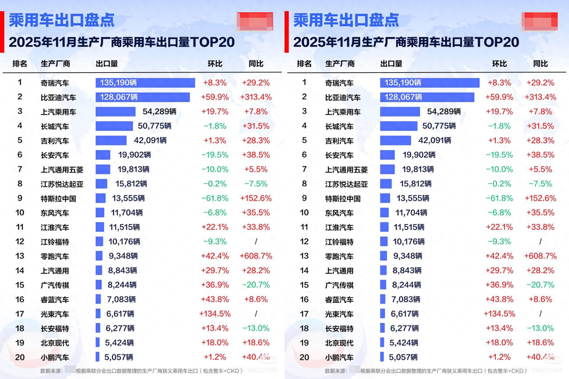 家人们,比亚迪这波出海成绩单也太强了!权威数据显示,2025 年11月光是乘用车出口就卖了 12.8 万台,比去年同期直接暴涨 313.4%,相当于翻了三倍还多!