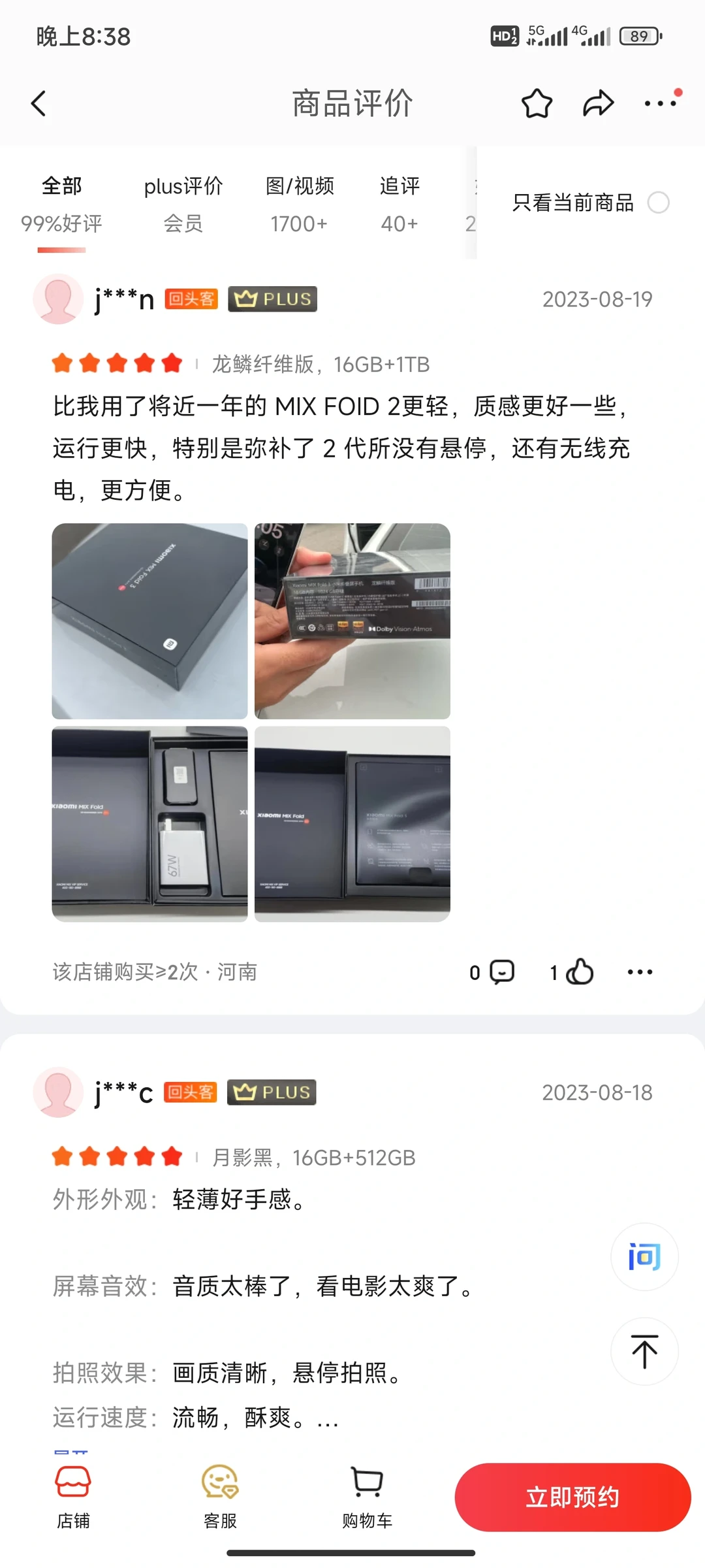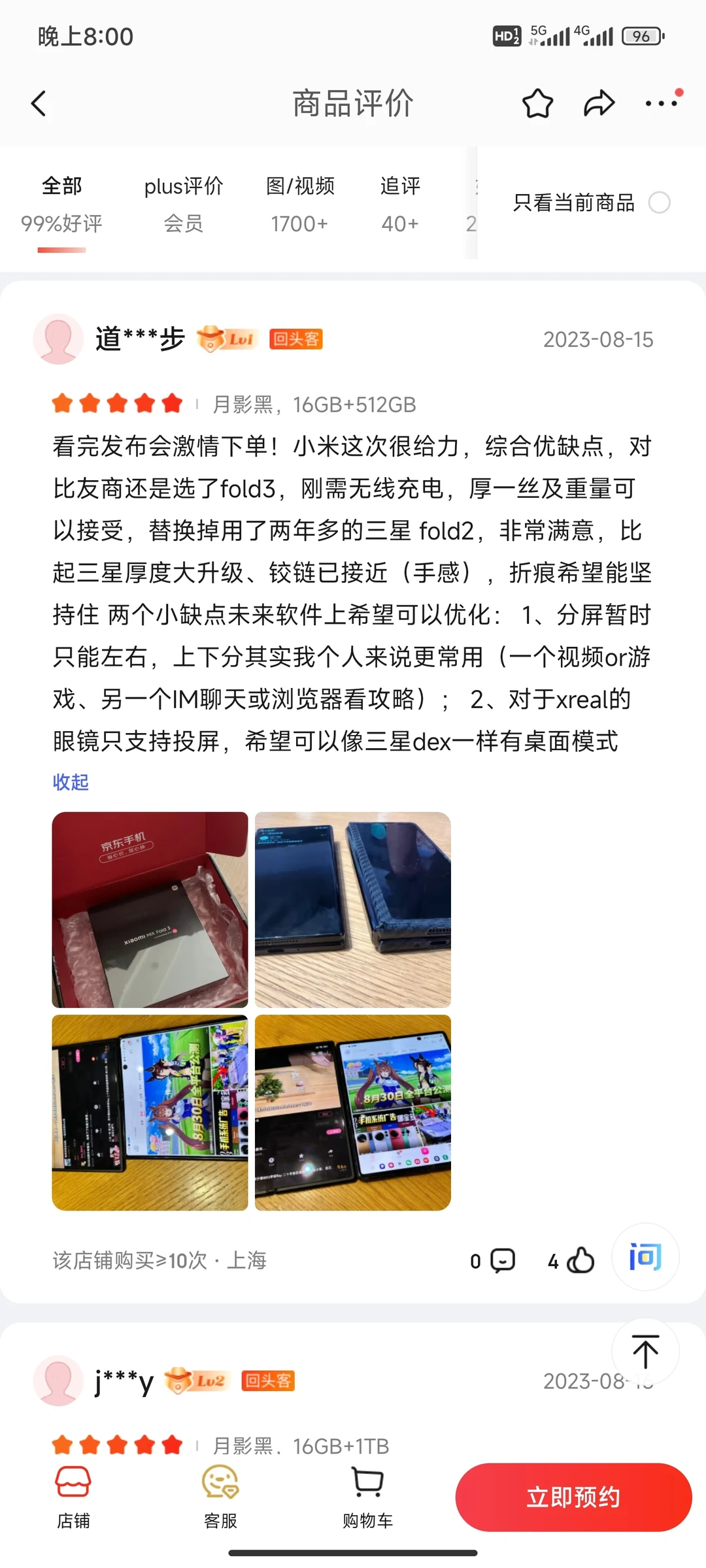 3、好评几乎100%,看过去上手的第一感觉基本都是轻薄,比戴壳的旗舰手机轻。第二感觉基本是对小米龙骨转轴好评的,质感提升大,开启丝滑,悬停角度补齐,手机开启或展开,手感都一级棒,另外像这么配置全面的折叠屏手机市面上也没有。