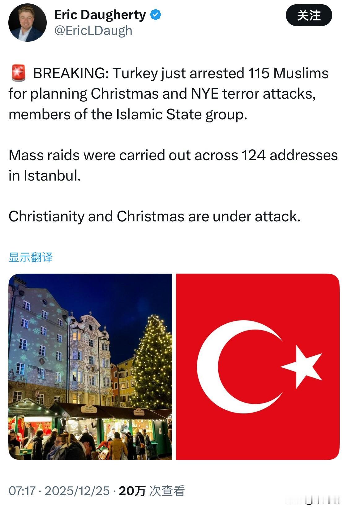 突发新闻:土耳其警方反恐部门刚刚逮捕了 115 名穆斯林,他们被指控策划圣诞节和新年夜恐怖袭击,这些人都是伊斯兰国组织的成员。警方在突袭中缴获了多支枪支、弹药和组织文件。 警方在伊斯坦布尔的 124 个地点进行了大规模突击搜查。检察官办公室共发出了 137 份逮捕令,其中 115 名嫌疑人已被拘留。 基督教和圣诞节正遭受攻击。