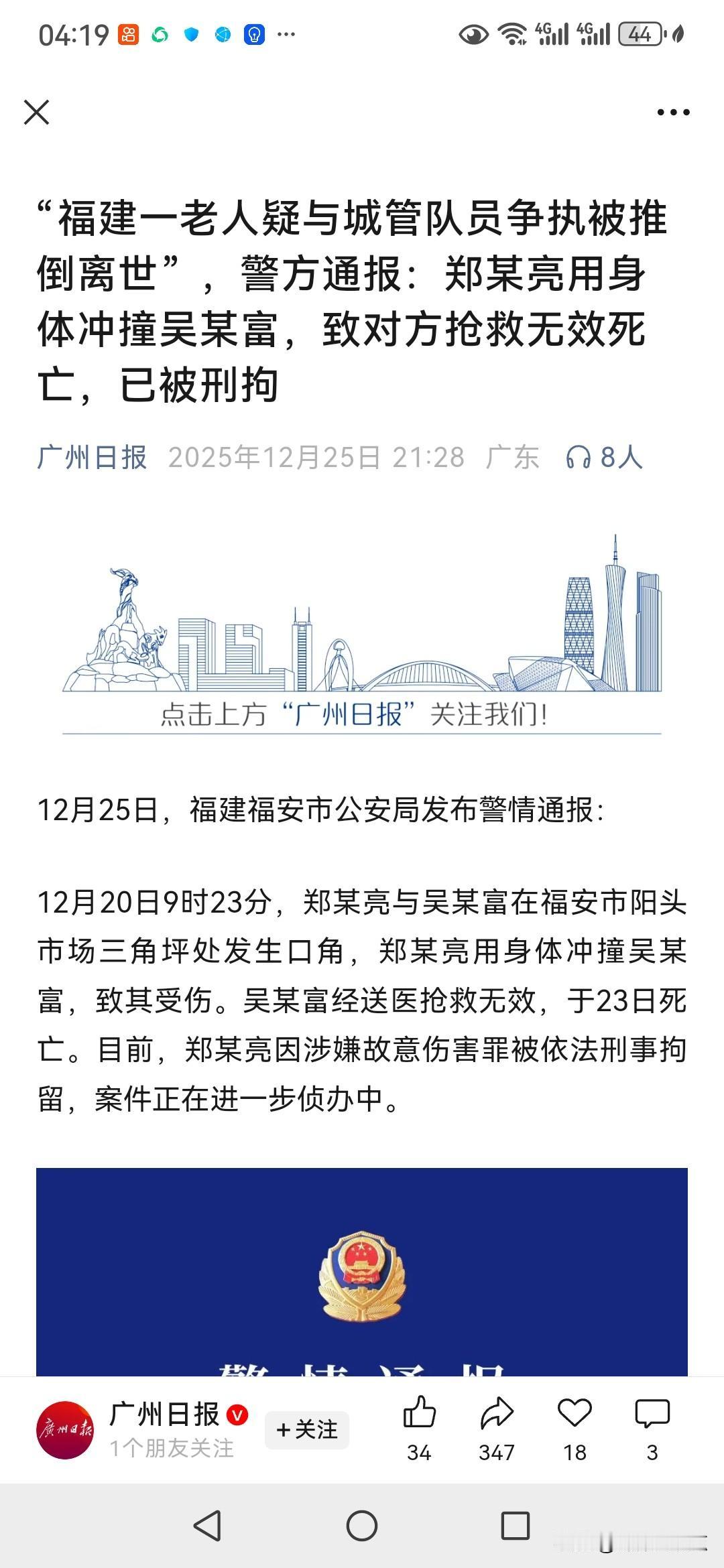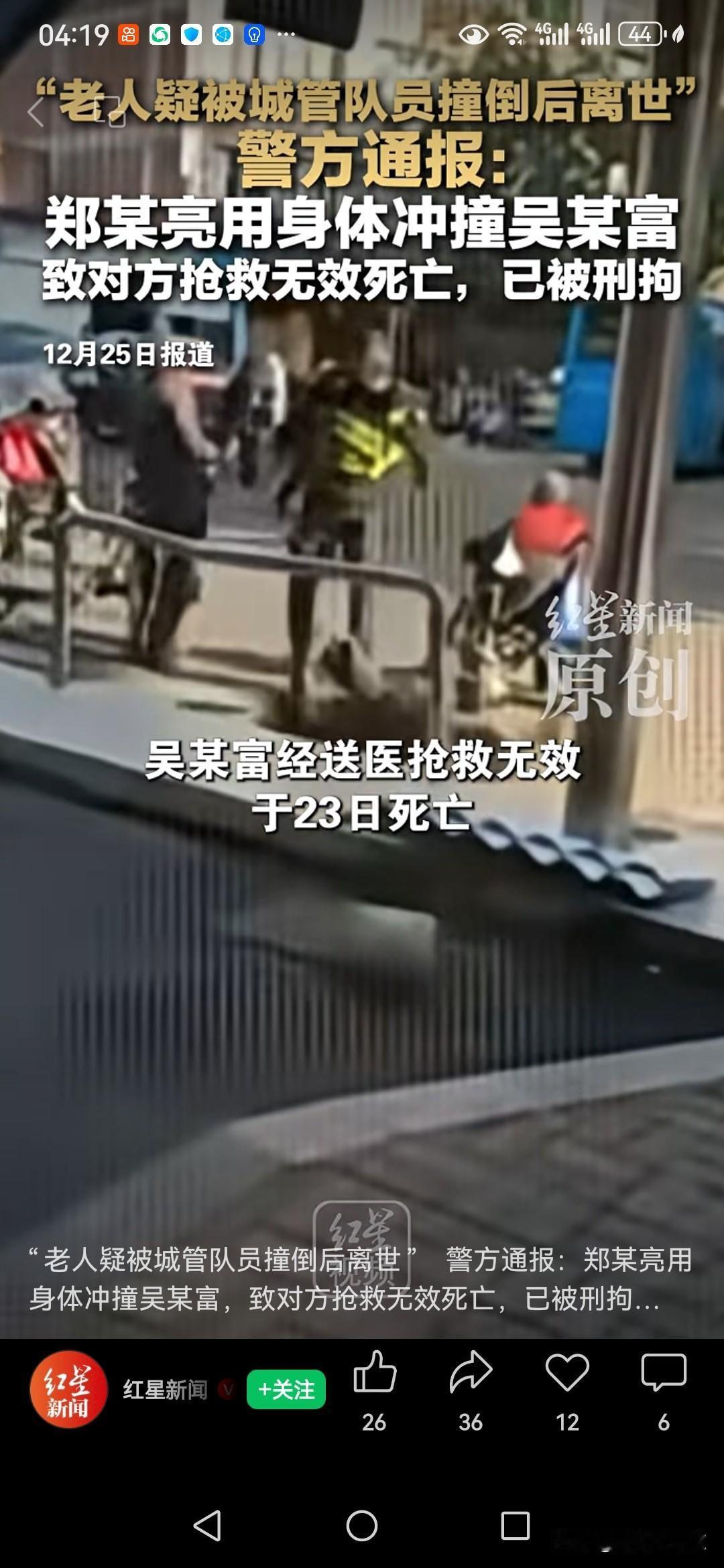 城管人员在执法中还须克制情绪,被管理人也要克制情绪,不然会出事,福建福安就有这样的案例! 老记浏览头条看到官媒广州日报和红星新闻的报道,老人疑被城管队员推倒后离世,福建福安警方发出通报:郑某亮已被依法刑拘。 据警方通报,案情经过是这样的。12月20日这天,郑某亮与吴某富在福安市阳头市场三角坪处发生口角,郑某亮用身体冲撞吴某富,致其受伤。吴某富经送医抢救无效,于23日死亡。目前,郑某亮因涉嫌故意伤害罪被我局依法刑事拘留,案件正在进一步侦办中。 来源:福安公安、华商报大风新闻。 你看,这就是自己没克制住自己的情绪导致了悲剧发生。按说,城管执法人员也是为了工作,比如,有人在马路上摆摊,城管队员在制止中如果急躁或处理的方式方法不对就会加剧矛盾的冲突,这个时候就需要执法人员克制住自己情绪。当然,摆摊的老百姓也要理解城管执法人员的苦衷,双方都理解也就不会造成悲剧。比如我市有一街道,原本不是市场,但一到周末,好家伙,各种摊贩摆摊设点把路堵的几乎没有缝隙,骑车的,蹬三轮的别想过去,心里想骂街,这时候就盼望城管执法人员赶到啊。有人说了,你们平时对城管执法人员愤愤不平,这时候想起城管来了?当然上述福安发生的悲剧,老记不详,不知道是怎样发生的。老记的意思是城管执法人员还要克制自己的情绪以理服人,被管理的不管是摊贩还是其他人也要克制自己的情绪,不然就会出事,各位说说是不是这个理儿? 以上是官媒报道,老记陈述事实,说理摆理,善意提醒双方都克制,尽可能不让悲剧发生并无不良引导!