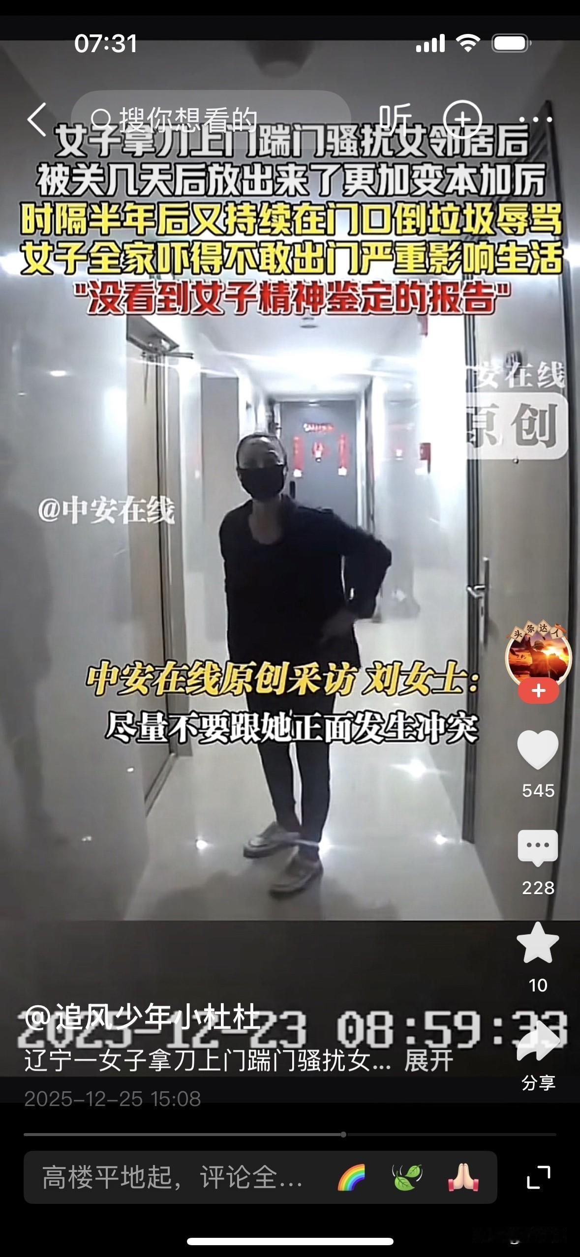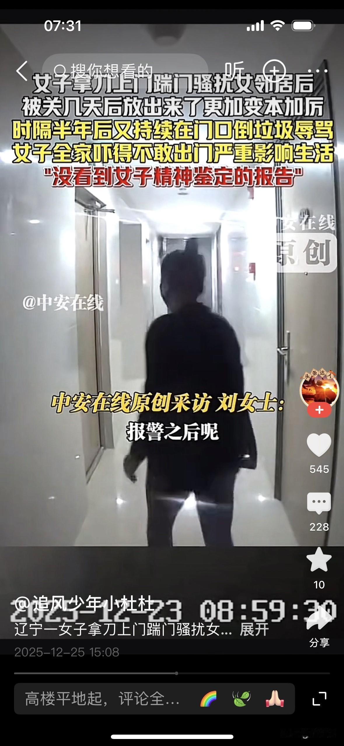 [微风][彩虹]女子持刀上门骚扰 邻居全家不敢出门!精神病绝不能成“护身符”,碰上这样的邻居也是闹心 现在这社会,真是什么人都有。邻里之间,本来抬头不见低头见,谁能想到,会被同一个楼道的人逼到不敢出门,更没想到,还是个上了年纪的女人,能野蛮到这种程度。 网上看到大连这起新闻,真是替当事人捏一把汗。刘女士一家为了孩子上学,咬牙买了套二手房,想着终于有个安稳窝,结果刚搬进去没多久,就被楼下一位六十多岁的女邻居盯上了。 这位女邻居一口咬定,刘女士家在“脑控”她、用“辐射”害她,这些听着就离谱的说法,她却当成真事。先是在业主群里指名道姓骂人,话难听极了,后来干脆从线上闹到了线下。 一开始是往家门口堆垃圾、故意制造噪音,再往后发展到不分昼夜踹门、拍门。最吓人的一次,她竟然拿着菜刀,对着刘女士家的防盗门一顿乱砍,楼道里都是金属撞击的声音,隔着屏幕都能想象那种恐惧。 刘女士不是没报警,可每次处理完,人关几天就又放出来。出来之后不但没收敛,反而变本加厉,在门口倒剩饭剩菜、泼脏水,用硬物在墙上刻字,嘴里还不停威胁,说什么“做鬼也不放过你们”。 这家人现在是能不出门就不出门,孩子不敢一个人上下学,老人有基础病,被吓得血压、心脏都出问题。好好一套房子,成了他们心里的牢笼。想卖房逃离,可谁愿意接盘?原房主和中介当初知情不报,让他们一点防备都没有。 最让人气愤的是,事情闹到这一步,大家都能看出来,这名女邻居精神状态明显不正常,当地也承认她“疑似有精神问题”。既然都知道是精神问题了,那派出所直接联系精神卫生机构,依法送医、强制治疗,不就是最基本的操作吗? 可现实却是:人关几天就放回家,继续在小区里晃悠,继续骚扰、威胁别人。精神鉴定做了大半年,结果迟迟不出,责任谁来负,成了一笔糊涂账。她的家属也一句话:“她有精神病,我们也管不了”,把监护义务推得一干二净。 很多人一提到这种事,就会说“她是病人,别跟她计较”。可问题是,病人需要治疗,不是需要“免罪”。精神病从来不该是骚扰别人、威胁别人的挡箭牌,更不是可以随意伤害他人的护身符。 法律如果对这类行为处罚太轻,只是走个形式,既治不了病,也震慑不了人,最后受委屈的永远是普通老百姓。该强制治疗的就要送医,该追究监护人责任的就不能放过,该追责相关部门不作为的,也得有人站出来给个说法。 想想以前那些悲剧案例,很多都是长期滋扰没人管,最后演变成恶性案件。等出了人命再重视,就太晚了。我们都希望生活在一个有秩序、有安全感的社会,可安全感不是天上掉下来的,是靠一个个具体的案子、一次次及时的处置堆出来的。 真心希望这件事能有个明确结果:该做的鉴定赶紧做完,该送医的依法送医,该负责的人一个都别跑。也希望以后再遇到类似情况,相关部门能第一时间介入,别再让“她有精神病”成为一句搪塞的理由,让受害者一次次陷入无助。 你身边有没有见过这种让人头疼的邻居?如果有,我也可以帮你理一理,遇到类似情况,该怎么保留证据、怎么跟社区和警方沟通,尽量把风险降到最低。