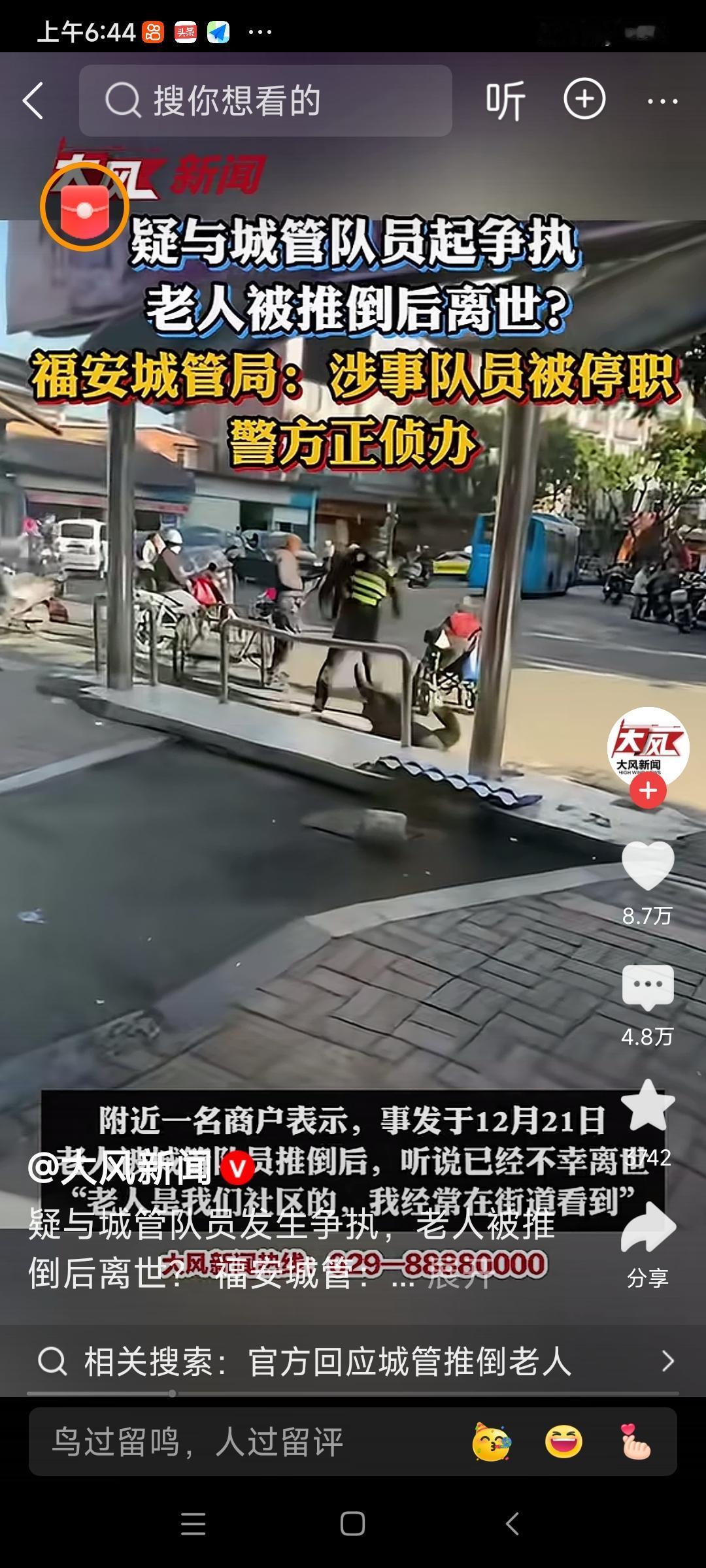 震惊!86岁老人路见不平被城管推倒身亡,真相令人心碎!你怎么看? (素材来源网络) 在这个繁忙的城市角落,发生了一件令人震惊的悲剧。一位年仅86岁的老人,因为一句“路见不平”的话语,竟然被城管推倒在地,最终不幸离世。这一幕像一记重锤击打在无数人的心头,也引发了社会的广泛关注和热烈讨论。事情的真相究竟是什么?我们一起来揭开这个令人心碎的故事。 事情发生在河南某条繁忙的街道上。那天,路过的老人看到城管队员在清理摊位,劝导摆摊者离开。老人虽然已年迈,但依然关心街头的秩序和市容,出于善意,他试图劝说城管不要过于粗暴。可谁曾想,这一善意的举动竟引发了悲剧的导火索。 据现场商户和路人透露,老人当时没有摆摊,他只是路过,看到城管在执法,出于“路见不平”的心态,便上前劝阻。老人当时情绪激动,用河南当地话骂城管,言辞激烈,甚至涉及到家人和亲戚,现场几十米外都能听到他的咒骂声。 令人愤怒的是,城管队员在面对老人激烈的言辞时,没有选择耐心劝导,而是直接动手,将老人推倒在地。视频画面显示,老人被推倒后,似乎没有立即反抗,但倒地后就再也没有起来。随后,老人被送往医院,不幸于几小时后宣告离世。 官方通报称,事件中推倒老人的人是临时工,强调城管队员在执法过程中没有过错,推倒老人纯属意外。然而,现场的目击者和部分商户透露,事情的真相远比官方报道复杂。 有人指出,现场监控录像并未完全公开,只有片段录像流出,无法还原全部经过。有人怀疑,事件背后可能存在执法不当或暴力执法的问题。更有人提出疑问:为何老人会与城管发生冲突?是否因为老人出于善意而被误解?还是有人在事件中有其他隐情? 值得注意的是,这条街上经常有人开着三轮车摆摊,占据了道路的一半空间,造成交通堵塞。城管多次劝导,但未曾动手。而这次,却发生了如此悲剧,难免让人质疑执法的方式和态度。 这起事件再次引发公众对城市管理与人性关怀的讨论。执法的底线在哪里?善意与冲突的界限在哪里?我们是否应该用更温和、更理性的方式解决类似问题?而对于一位老人来说,他的善意和正义是否被误解? 目前,事件仍在调查中。有关部门需要全面调取监控录像,查明真相,还老人一个公道。我们也希望,相关执法人员能反思执法方式,避免类似悲剧再次发生。 这起悲剧让我们每个人都感到痛心,也提醒我们在面对社会矛盾时,更应多一份理解和宽容。城市管理固然重要,但人的生命和尊严更应受到尊重。 你怎么看待这起事件?你是否也曾遇到过类似的冲突?你认为,执法者应如何在维护秩序的同时,体现人性关怀?欢迎在评论区留言分享你的看法,让我们共同关注,呼吁更公正、更温暖的城市管理! 这起悲剧的背后,或许隐藏着我们每个人都应反思的问题:我们在城市生活中,是否也在无形中忽略了那些需要关心的人?你是否愿意为一个更温暖、更有温度的城市贡献一份力量? 让我们一起关注,传递正能量,让悲剧不再重演!如果你觉得这篇文章触动了你的心,别忘了点赞、转发,让更多人看到真相。你的每一个行动,都是对生命的尊重和对社会的责任。