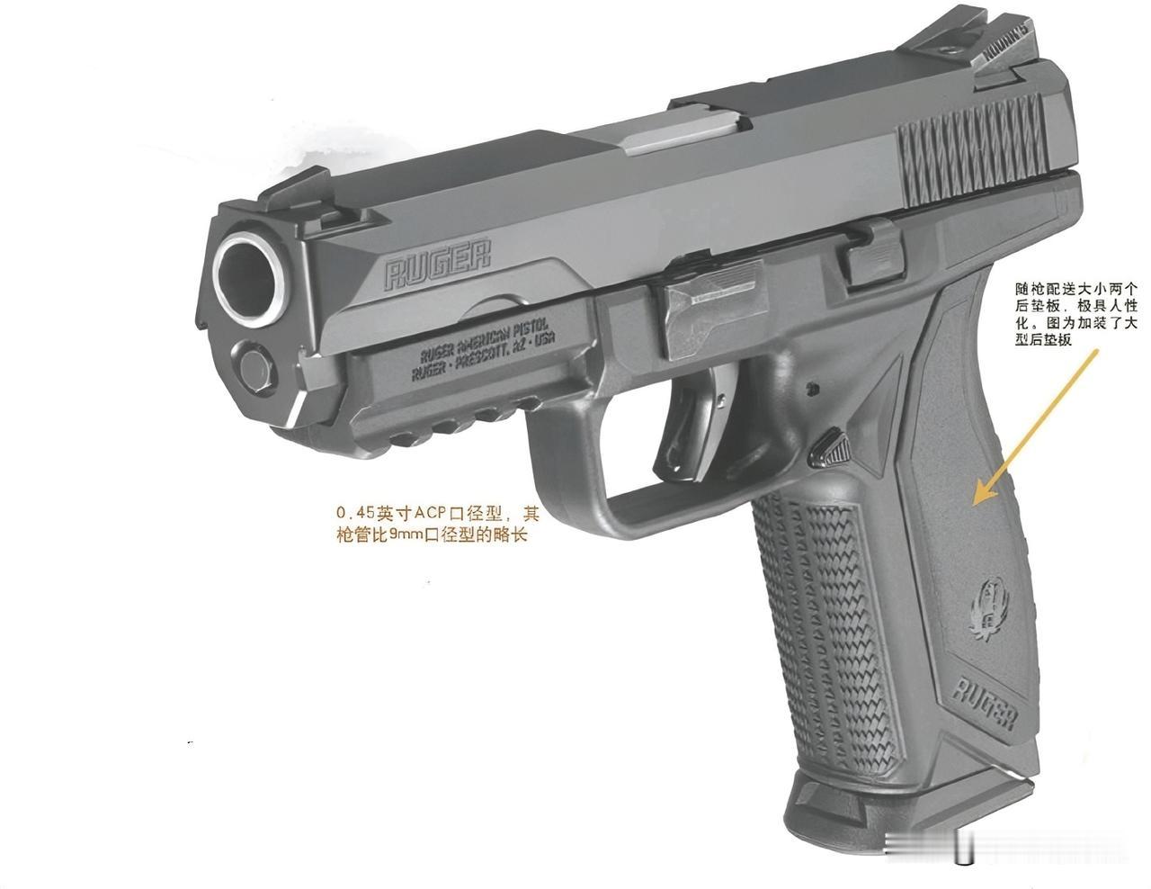 鲁格公司“鲁格美国人”手枪 鲁格“美国人”手枪,是鲁格公司给美国军警部门打造的一款大尺寸实战用枪。 这款枪在设计的时候,特意找了美国的警察、军警教练、懂轻武器的行家还有卖枪的商户征求想法,就是为了做出一把军警人员用着得劲的手枪,它的名字也是这么来的。 它采用枪管短后坐的自动射击方式,套筒用钢材制作,表面做了黑色氧化处理,又耐用又抗造。 套筒座是聚合物材料做的,又轻又结实,前端下面有个皮卡汀尼导轨,能轻松装上激光瞄准器这类配件。 握把前面有波浪形状的防滑纹路,握在手里稳稳当当,不会轻易打滑。 为了让不同的人用着都舒服,枪里还带了一大一小两个后垫板,大家可以根据自己手掌的大小来选,特别实用。 这款枪的扳机不用费多大劲就能扣动,而且扣起来很顺滑,适合快速连续开枪,扳机上还装了保险,用着特别放心。 现在这款枪有两种口径,一种是9×19毫米巴拉贝鲁姆口径,枪管长107毫米,弹匣能装17发子弹;另一种是11.43毫米ACP口径,枪管长114毫米,弹匣能装10发子弹。