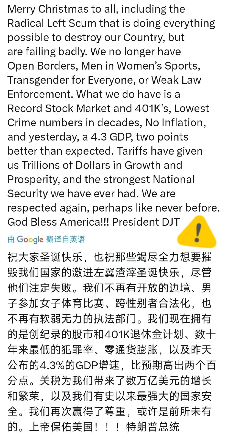 圣诞祝福带火药味?特朗普这波发文直接把竞选宣传拉满,一边骂对手是“渣滓”,一边狂吹经济“成绩单”,套路还是那么熟悉! 4.3%的GDP增速是真的,但这只是三季度数据,全年预估才2%左右,政府停摆还等着拖后腿。所谓“零通胀”更是睁眼说瞎话,实际通胀仍有2.7%,食品能源价格比疫情前还高。401K退休金看似规模涨了,实则被塞进私募、加密货币等高风险资产,普通人的养老钱都快成华尔街的“赌注”。 特朗普这套“吹数据+骂对手”的组合拳,本质是给支持者画饼。政治宣传不是靠信口开河,民众的生活体感骗不了人。把复杂经济问题简化成口号,终究是自欺欺人。你觉得这种宣传能帮他赢得支持吗?