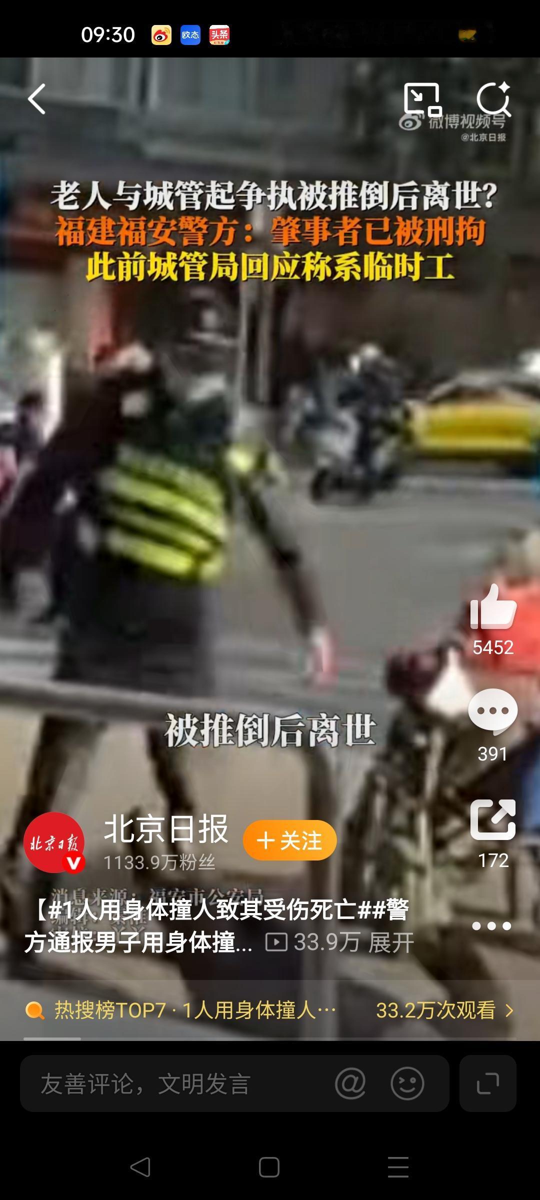 天呐!身体一撞致人死亡 今日热推 家人们,看到“1人用身体撞人致其受伤死亡”这消息,我瞬间头皮发麻!福建福安市公安局12 月 25 日的这则通报,揭开了一起令人痛心的悲剧。 12 月 20 日,在福安市阳头市场三角坪,郑某亮和吴某富口角之后,郑某亮这一撞,就改变了两个家庭的命运。吴某富经抢救无效,于 23 日离世,郑某亮也因涉嫌故意伤害罪被刑拘。这一撞,撞碎了一个家庭的希望,也让郑某亮自己陷入了万劫不复的深渊。 再结合多家媒体此前报道,网友曾传是老人与城管队员争执后被推倒离世。这中间的真相到底如何,是单纯的口角冲突失控,还是另有隐情?这背后反映出的人性问题值得我们深思。在生活中,我们难免会遇到摩擦和争执,但难道就要用如此极端的方式去解决吗? 这起事件也给我们敲响了警钟,冲动是魔鬼,一时的愤怒可能会让我们付出无法挽回的代价。我们每个人都应该学会控制自己的情绪,用理智去处理问题。 大家觉得这起事件中,是什么导致了郑某亮如此冲动呢?在生活中遇到类似的冲突,我们该如何更好地处理呢?快来评论区分享你的看法吧!社会百态 社会新闻