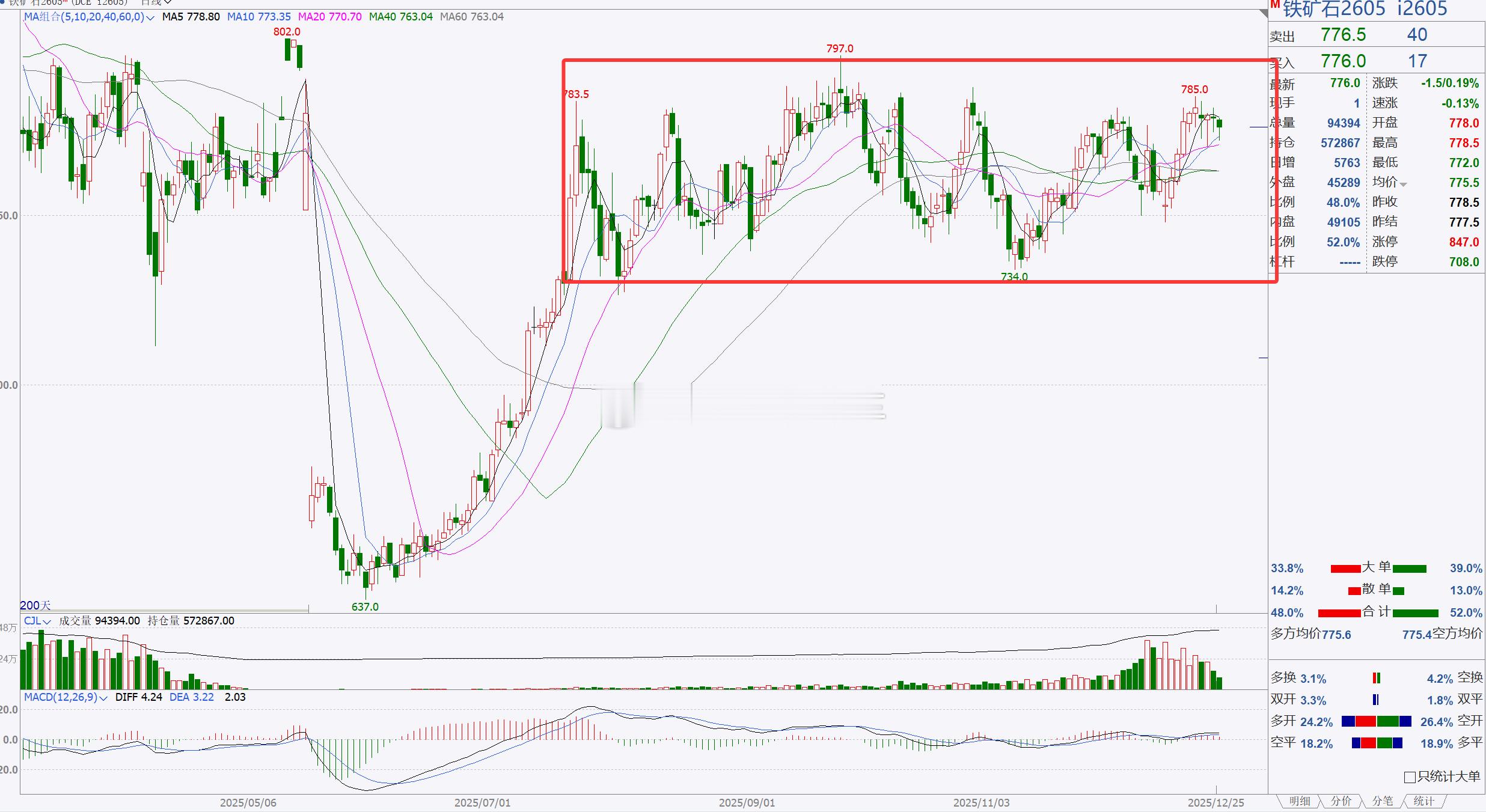 1、【焦煤2605】焦煤重点关注1100一带,短线跟进!焦煤目前依旧处于横盘调整阶段,虽然行情突破了1150一带,但是未能站稳,后市建议重点关注1100一带,若企稳,还有反弹调整预期,建议短线跟进即可;稳健者建议先观望;例如多关注1098—1088附近,上方先关注1150一带,突破再关注1200附近;空关注1150、1200这两个位置再择机考虑介入;(建议仅供参考,具体操作以开盘点位实时跟进,据此操作风险自担)2、【铁矿石2605】铁矿石回踩偏多,看短期反弹调整!铁矿石目前处于横盘调整,行情表现一般,后市建议短线偏多跟进,看短期反弹调整,重点关注800一带,稳健者建议先观望;例如多关注772—770附近,上方先关注800附近;空关注800突破情况再择机考虑介入;(建议仅供参考,具体操作以开盘点位实时跟进,据此操作风险自担)焦煤铁矿石螺纹