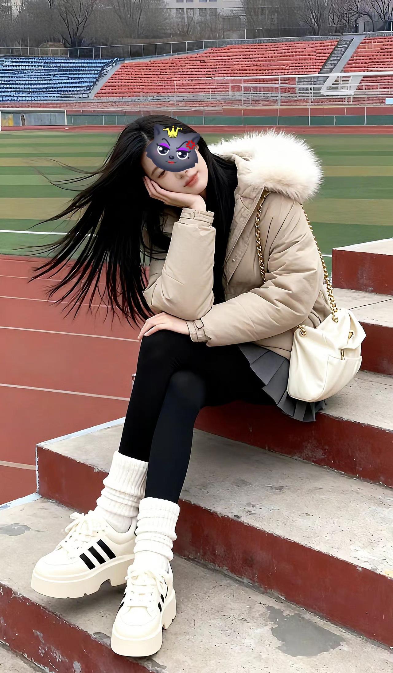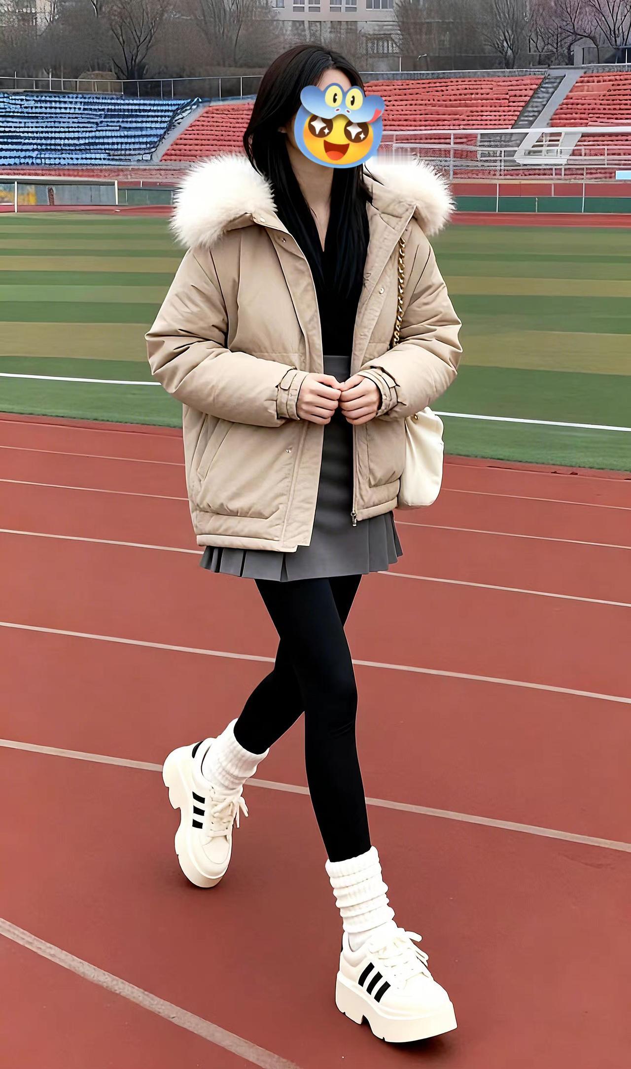 卡其毛领羽绒服裹满暖意,灰百褶裙+黑丝叠白堆堆袜,再搭奶白链条包和厚底鞋,站在跑道边就是青春感爆棚的冬日甜妹。冬日甜酷风穿搭 户外 每日分享 校园风