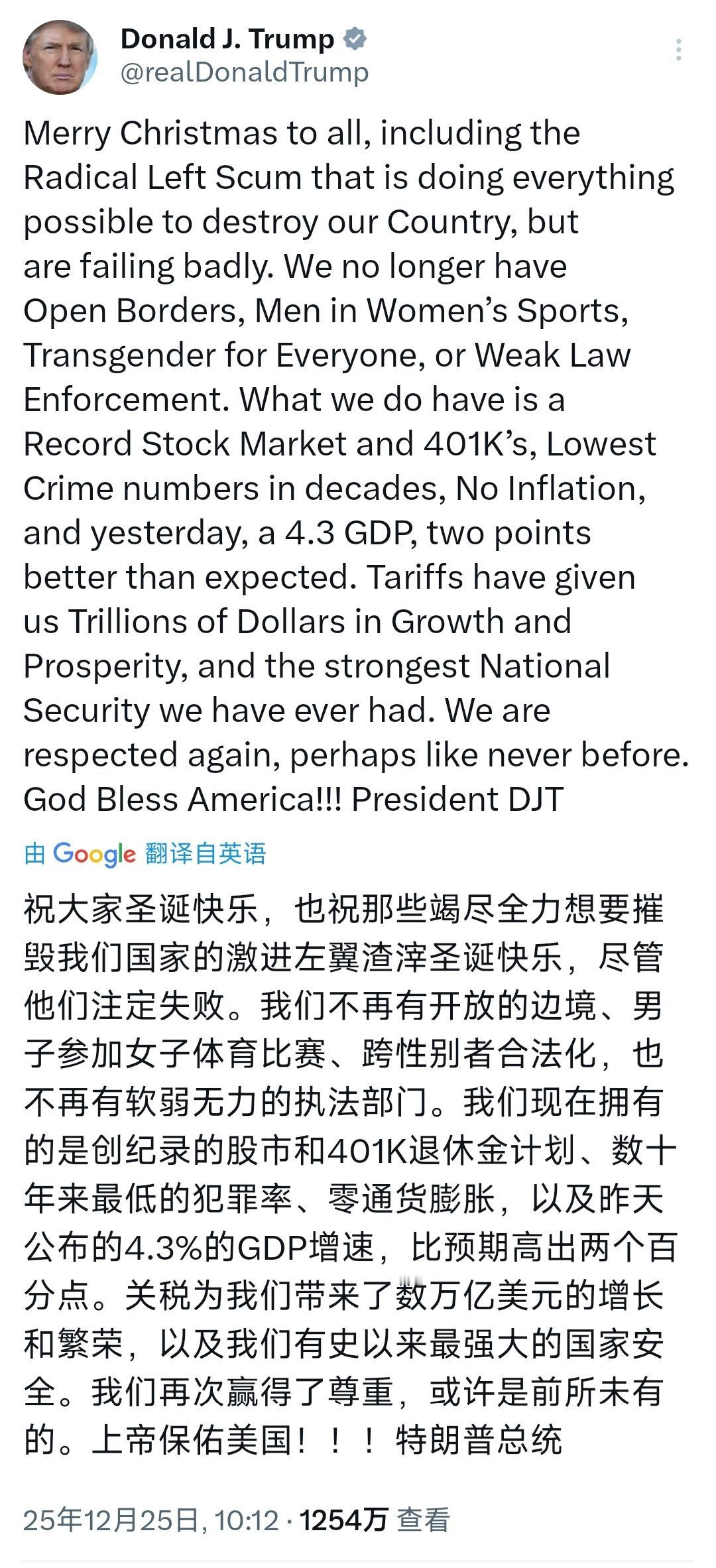 特朗普圣诞发文太敢冲!怼对手吹政绩,老特式风格直接拉满 咱就是说,特朗普这性子是真没改,圣诞节都不忘出来刷存在感。北京时间 12 月 25 日他发文送圣诞祝福,转头就把激进左翼骂成 “渣滓”,放话对方注定失败,火药味都快飘出屏幕了。还大夸自己的 “成绩”,说边境不开放了、执法不软弱了,股市和退休金创纪录,犯罪率几十年最低,甚至喊出 “零通货膨胀”,连 4.3% 的 GDP 增速都拿出来说,宣称关税带来大笔繁荣、国家安全最强。 可这话听着热闹,实则真假参半没边儿。美国经济积弊已久,通胀、民生问题一直没解决,所谓 “零通胀” 纯属自欺欺人,关税带来的也不是什么万亿繁荣,反而给不少行业添了麻烦。他嘴里的亮眼政绩,多半是往自己脸上贴金的吹嘘。 熟悉特朗普的都知道,他向来爱靠这种强势发言博关注、拉支持者,以前执政时就常靠夸张言辞塑造形象。说白了,这波圣诞发文不是单纯送祝福,更像是一场政治秀,想靠怼对手、吹政绩巩固自己的基本盘。 毕竟民众心里都有杆秤,虚假宣传骗不了人,顶多沦为谈资。
