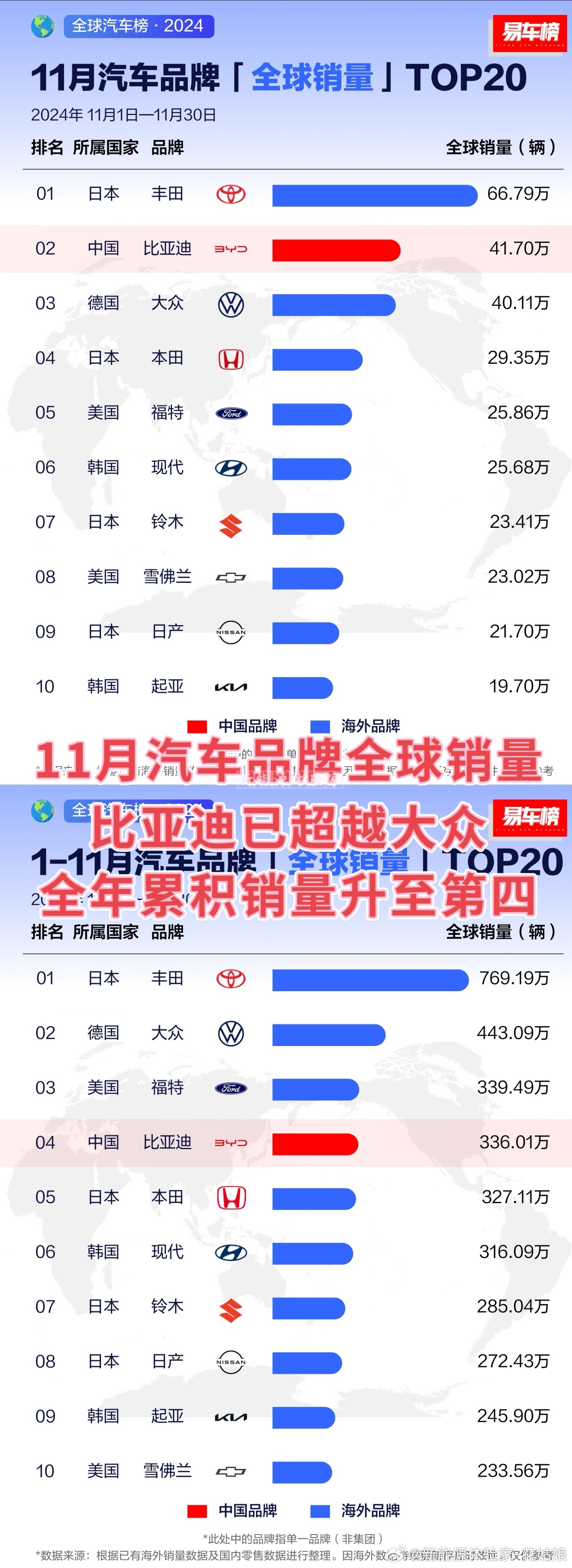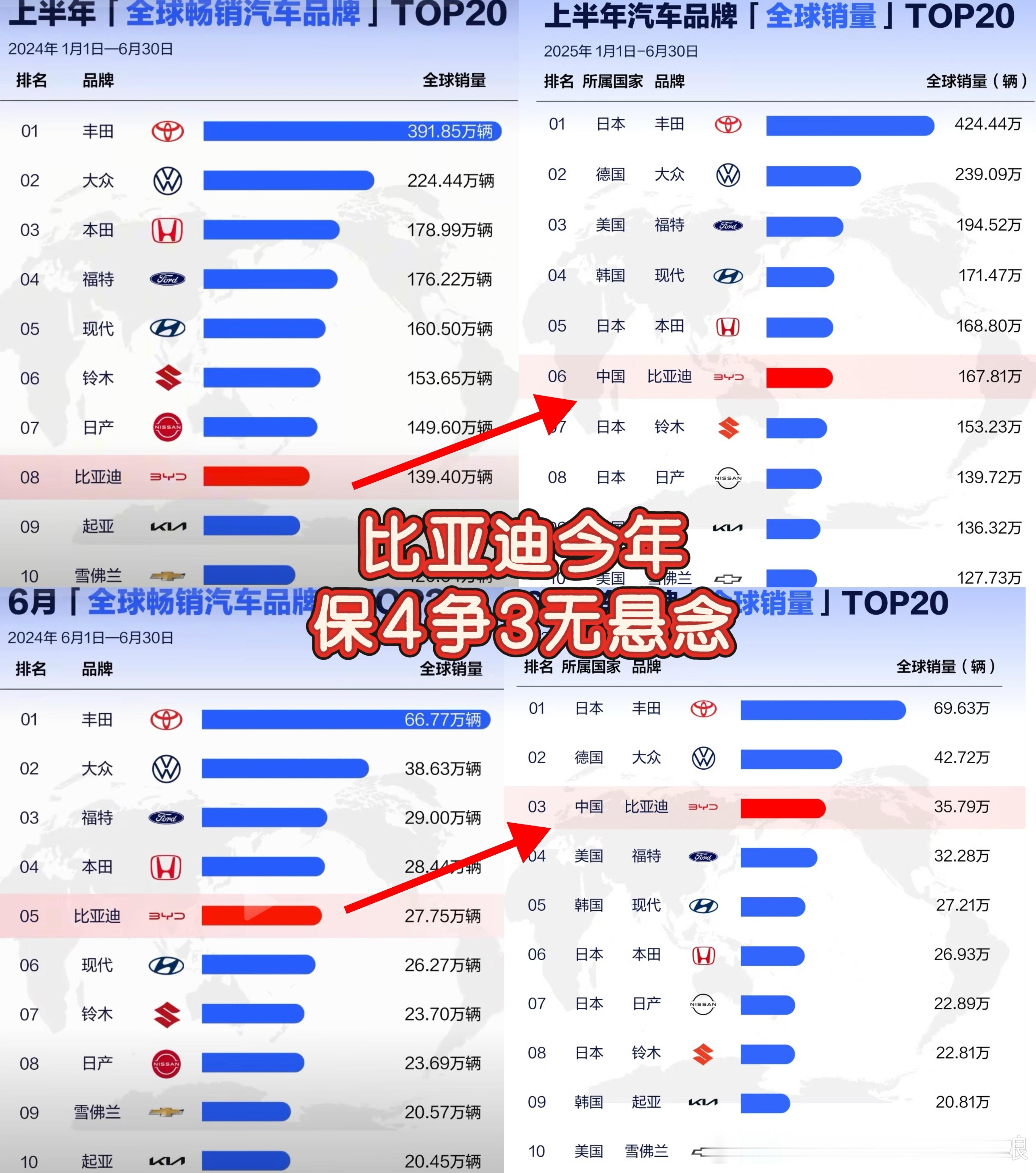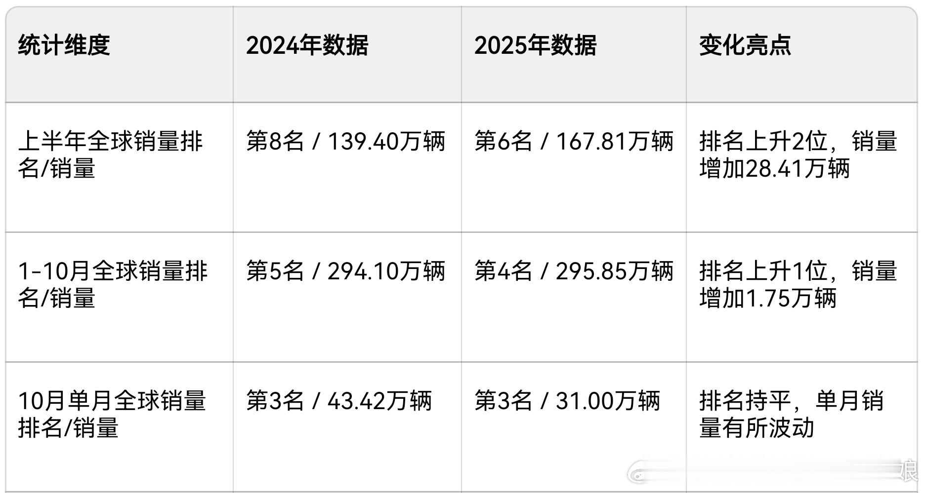 比亚迪一挑九,中国红!主打一个“一年一个台阶”!2024年上半年第八,2025年上半年第六;2024年1-10月第五,2025年1-10月期第四,24年11月还直接超了大众当第二,25年11月会不会再次超过大众呢?受春节等因素影响,比亚迪每年对国外车企的追赶都是逐月先抑后扬,因此看单月意义不大,还要看每年逐月累计~比亚迪大v聊车新能源大牛说