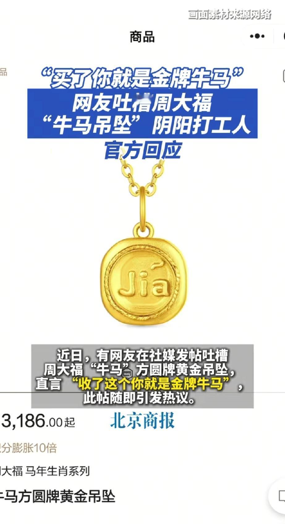 笑死了!一女子网上选购金首饰时,突然看到周大福出了一个黄金吊坠,而吊坠上面竟然写着“牛马”两个字,后面还有个"jia",女子当场就提出了质疑,这样的吊坠不是在嘲讽打工人吗? 周大福的新款吊坠,造型没啥特别,名字却让人扎心——“牛马吊坠”。“牛马”这俩字,现在可是打工人的专属自嘲,意思是天天辛苦干活、任劳任怨,带着点无奈和辛酸。 本来就觉得打工不容易,看到品牌把“牛马”做成饰品卖,“我们天天当牛马搬砖,还得花钱买个吊坠纪念?这不是在调侃我们吗?” 面对满屏质疑,周大福回应说,这款吊坠的寓意是“不怕吃苦、勤劳肯干”,是想传递正能量。可网友们根本不接受,觉得品牌完全不懂打工人的心声,就是在蹭热度、消费打工人的辛酸。 有网友说: “我辛辛苦苦上班,不是为了戴个‘牛马’吊坠提醒自己是牛马!” “正能量不是这么传递的,尊重打工人的辛苦比啥都强!” 说实话,我真的特别能理解大家的愤怒!打工人每天早出晚归,挤地铁、赶公交,受了委屈也得扛着,用“牛马”自嘲,是无奈也是自我安慰。可品牌却把这份辛酸当成卖点,还说是什么“正能量”,这不是往打工人心上戳刀子吗? 我们不怕吃苦,怕的是自己的辛苦被当成玩笑,怕的是品牌连最基本的尊重都没有。你想传递勤劳的精神,叫“奋斗吊坠”“拼搏吊坠”不好吗?非要用“牛马”这个带着自嘲意味的词,说到底就是想蹭流量,根本没考虑过打工人的感受! 这件事根本不是一款吊坠那么简单,而是品牌到底懂不懂尊重消费者。打工人的自嘲从来不是流量密码,每一份辛苦都值得被看见、被尊重。 品牌想要得到消费者的认可,不能只靠蹭热度、玩梗,得真正站在消费者的角度想问题,尊重大家的情绪和感受。 打工人的世界里,没有那么多“玩笑”,只有实打实的努力和坚持,这份坚持,容不得半点敷衍和消费!