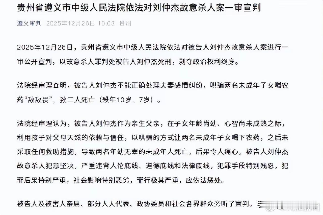令人痛心!贵州男子刘仲杰因夫妻感情破裂,哄骗10岁的儿子和7岁的女儿喝下农药后死亡! 因夫妻感情破裂,5月21两人鉴了离婚协议书后,丈夫刘仲杰带着农药回来,把她拖进卧室,捆住她的手脚,“说要一起死”。为了安抚他的情绪,黄女士主动撕毁离婚协议,随后逃离了。 5月22日刘仲杰还带着儿女吃了一顿烧烤,在社交平台扬言这是“最后的狂欢”。他哄骗孩子喝掺了农药的饮料,说喝了就能见到你妈妈了,俩个年幼的孩子根本不知道,就把饮料全喝了,而刘仲杰只喝了一口,就吐了。此后,也没采取任何抢救措施,导致两名年纪无辜的孩子死亡。 虽然说,夫妻感情破裂,但孩子是无辜的。他自己喝了一口吐了,还给孩子全喝了。真没想到还有这种父亲,对自己的亲生孩子下手。不配为人父,连禽兽都不如! 夫妻离婚,本来孩子在这样的家庭己经很可怜了,作为父亲应该是多关心孩子,多给孩子些温暖。怎么做出如此丧心病狂的事,真让人痛心。 刘仲杰犯罪手段极其残忍,犯罪后果特别严重,社会影响特别恶劣,罪行极其严重。12月26日以故意杀人罪判处刘仲杰死刑! 黄女士伤心地说,虽说刘仲杰为自己犯下的罪行受到应有的惩罚,但两个年幼的孩子再也回不来了。
