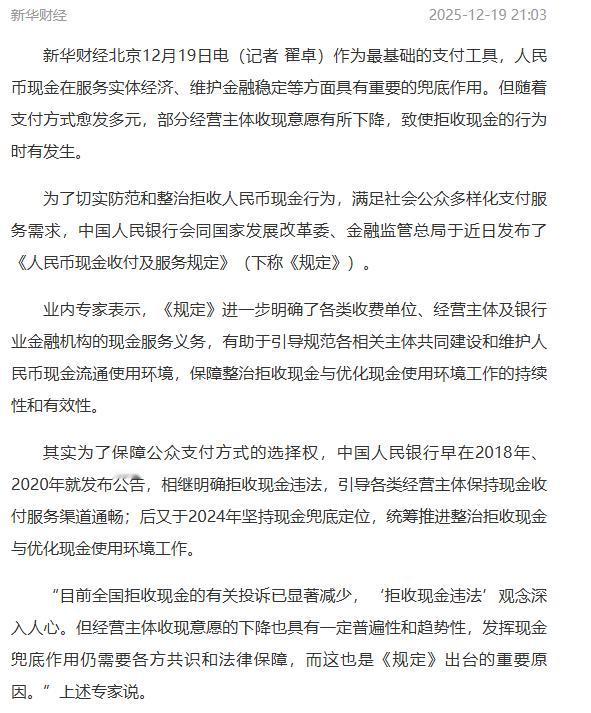 人民币现金支付,新规来了。以后任何单位,不论是学校银行加油站,或者医院,都不得拒收现金,否则会面临处罚。 你有没有碰到过这样的尴尬场面:拿着一张百元大钞,走进便利店买瓶矿泉水,结果被店员一句“我们只支持扫码”给挡在了门外? 老李头今年63岁,前两天陪老伴去医院看病,排了两个小时的队,好不容易轮到了,结果被告知“不支持现金支付”,差点当场急出一身汗。 不是不愿意用手机,而是不会用、不敢用,像老李头这样的情况,不是个例,而是现实中大量人的缩影。 所以,这次新规的出台,说白了,就是给钱包里的钞票“撑了腰”,从2026年2月1日起,谁要是敢拒收现金,不管你是开学校的,还是开加油站的,还是银行、医院窗口,统统不行,不收就罚。 人民币是国家定的“正牌货”,说白了就是法律明文规定的通用货币,谁都不能说不认,你喜欢刷码,那是你的自由,但人家掏出现金来买东西,你可不能甩脸子不接,这不是讲情分,这是讲规矩。 为啥要专门出个新规来强调这个?说到底,是咱们的生活被扫码支付“宠”坏了,动动手指就能付钱,久而久之,大家都快把纸币当成老古董了。 可问题是,老古董也是钱,不能因为你家换了智能电视,就嫌弃别人还在用遥控器的老款。 现在走在街头,不少摊贩、店铺、甚至医院窗口,动不动就贴个“仅限扫码”的牌子,看着方便,实则让不少人寸步难行。 那些年纪大的,不会用智能手机的;手不方便的,眼睛模糊的;还有刚下飞机的外国游客,看着二维码一头雾水——这不是买东西,是解谜题。 国家其实早就意识到这个问题,也一直在做事,比如让银行网点更适合老年人操作,开设专门窗口,甚至安排上门服务。 但问题就在于,如果你前面的小卖部、后面的公交司机都不收现金,那银行再怎么贴心,也只是空转,最后就变成了上游努力,下游摆烂。 所以这次新规,不只是针对商家,更是对整个支付环境来了一次“回炉重造”。 新规细得很,连什么场景必须收现金都给你划了重点,只要是“当面收款”的,比如人工柜台、窗口服务、到店取餐、出租车、商场、饭店,只要人站那儿,收钱的手就不能空着。 哪怕前面你是线上预约的,只要后面是线下交付的,比如点了外卖去店里拿,那商家就得收现金,不能借口推脱。 但凡有人的场合,就不能装作“无现金社会”提前上线,不仅要收,还得收得顺畅,商家不能说“有零钱你就给,没零钱我也帮不上忙”。 新规明确要求,要备好零钱,别动不动就来一句“我找不开”,说到底,现金支付不是“备选项”,而是“必选项”。 那有人可能要问了,像那些无人售货机、景区刷卡门禁怎么办?新规也想到了这些,像校园一卡通、景区年票这些封闭场所,必须在显眼的地方标出“你要用现金,来这儿办卡、这儿充值”,不能搞得神神秘秘,让人一头雾水,更不能拿“自动化”当挡箭牌,躲避责任。 说到这儿,不得不提一件事,2025年年初,河南某学校的学生服务部,就因为拒收现金,被央行罚了2万元,相关负责人也一起挨了罚。 类似的,还有湖北某邮政公司,拒收快递费现金,被罚1万元,这不是吓唬人,是实打实的处罚,接下来,这种“动真格”的监管还会持续,谁再敢装糊涂,就不是一张罚单那么简单了。 当然,别走极端,你拒收现金不行,但你也不能只收现金,比如之前有商家为了逃避法院执行,硬说“我只收现金”,其实就是想绕开银行转账,好把钱藏起来。 这说明什么?说明钱的流动方式,不是你一个人说了算,既不能强逼扫码,也不能硬拽着别人塞现金,支付方式的选择权,得落在消费者手里,而不是商家嘴上,你可以提供多种方式,但不能“拿捏”顾客。 说到底,现金不是老掉牙的东西,而是金融系统的“压舱石”,手机没电了,网络断了,App崩了,还是现金最靠谱。 尤其是在一些突发事件里,比如交通事故、自然灾害,真到了关键时刻,还是现金能救急,国家这次出台新规,其实是给支付系统加了一道“安全阀”,不是跟移动支付过不去,而是让两者并行不悖,相互补位。 新规也不是一锤子买卖,而是有章可循、有据可查,比如线上交易,如果是纯虚拟产品(比如游戏充值、网课购买),那商家要提前公示支付方式,别搞得人买都买了才发现“只能扫码”。 还有那些委托第三方收款的,比如物业费找银行代扣,商家要管好委托方,也不能让他们“甩锅”说“我们不负责”。 维权这块也有门路,公众遇到拒收现金的情况,别忍气吞声,可以拍照、录音,把证据留好,然后向当地央行分支机构投诉。 别小看这一步,很多处罚案例就是从群众举报开始的,新规给了你“说话”的权利,也给了监管机构“动手”的底气。 说穿了,这次新规不是为了给现金“刷存在感”,而是重新梳理了一个公平合理的支付秩序,不是要回到“全靠现金”的年代,而是要防止走向“只靠扫码”的死胡同,移动支付是进步,但不能变成绑架。